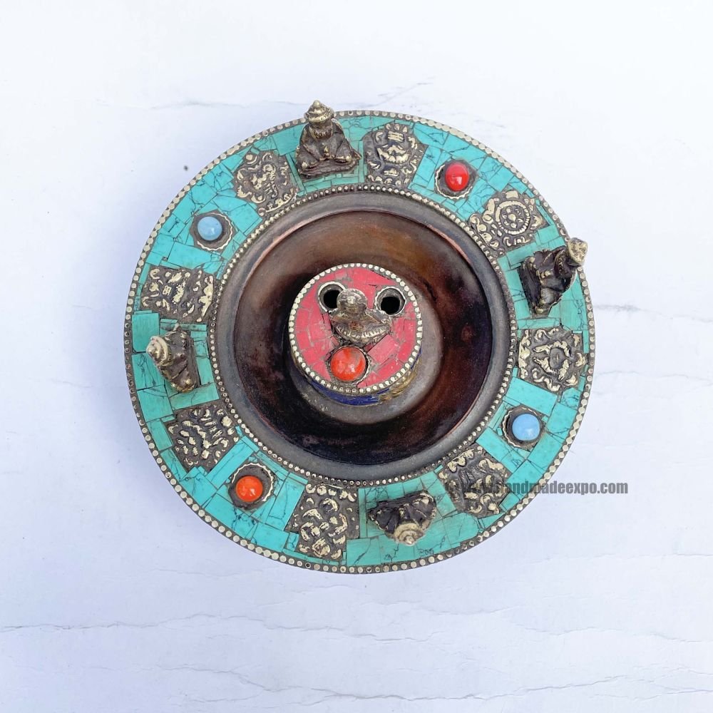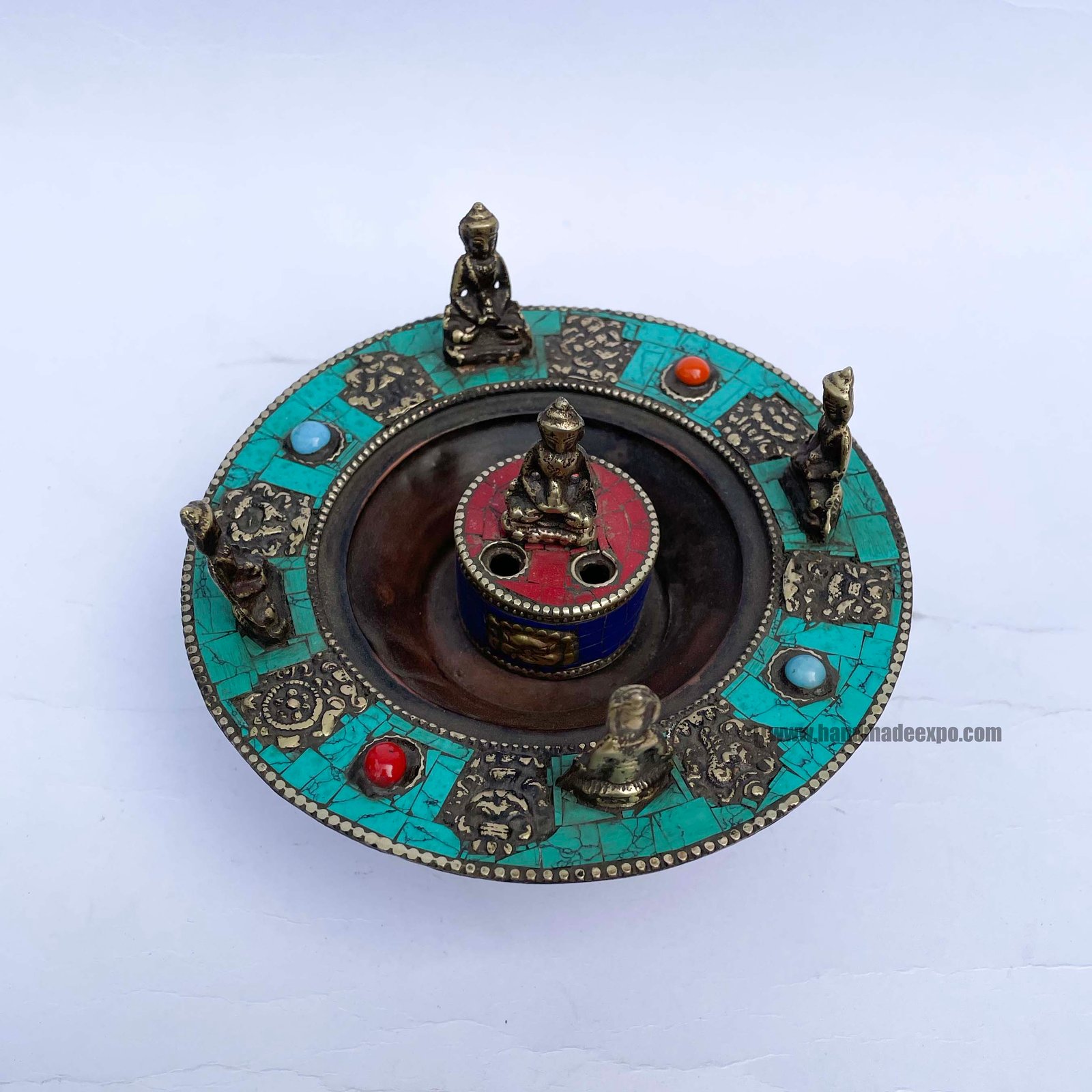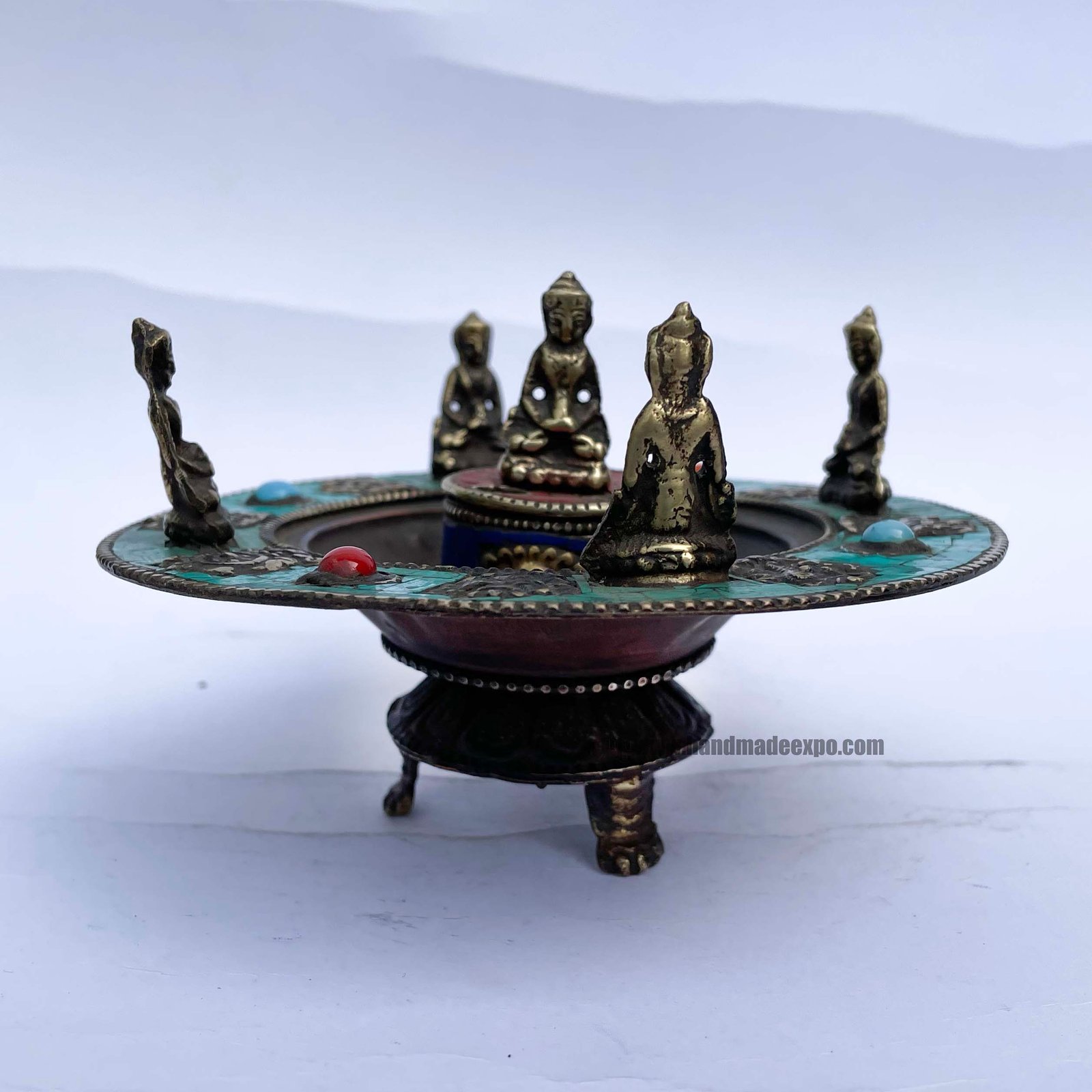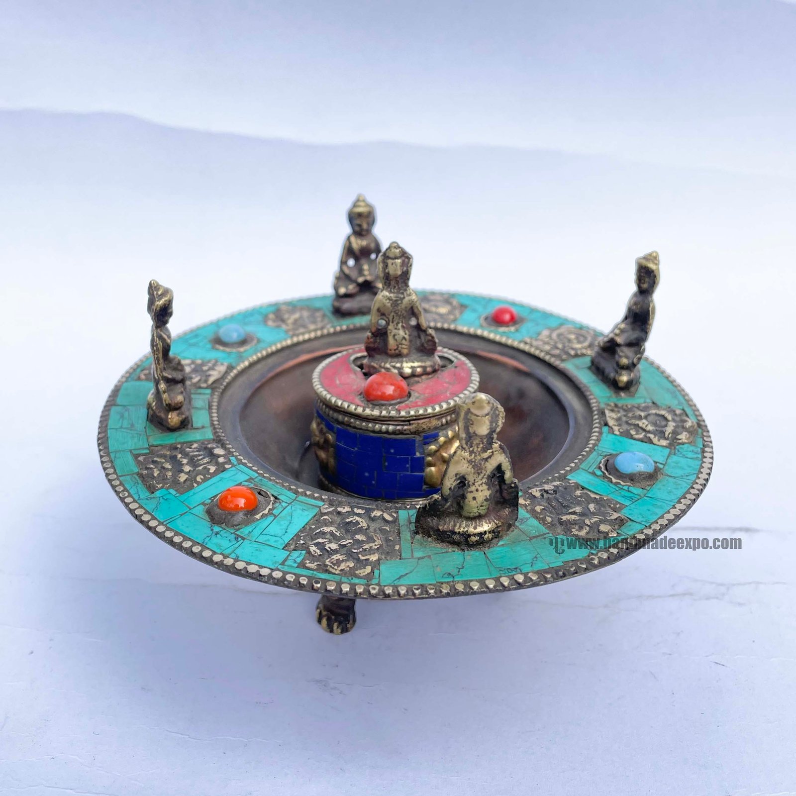 Hand Beaten Metal Dhakya Cup, Turquoise Stone Setting, with Pancha Buddha |