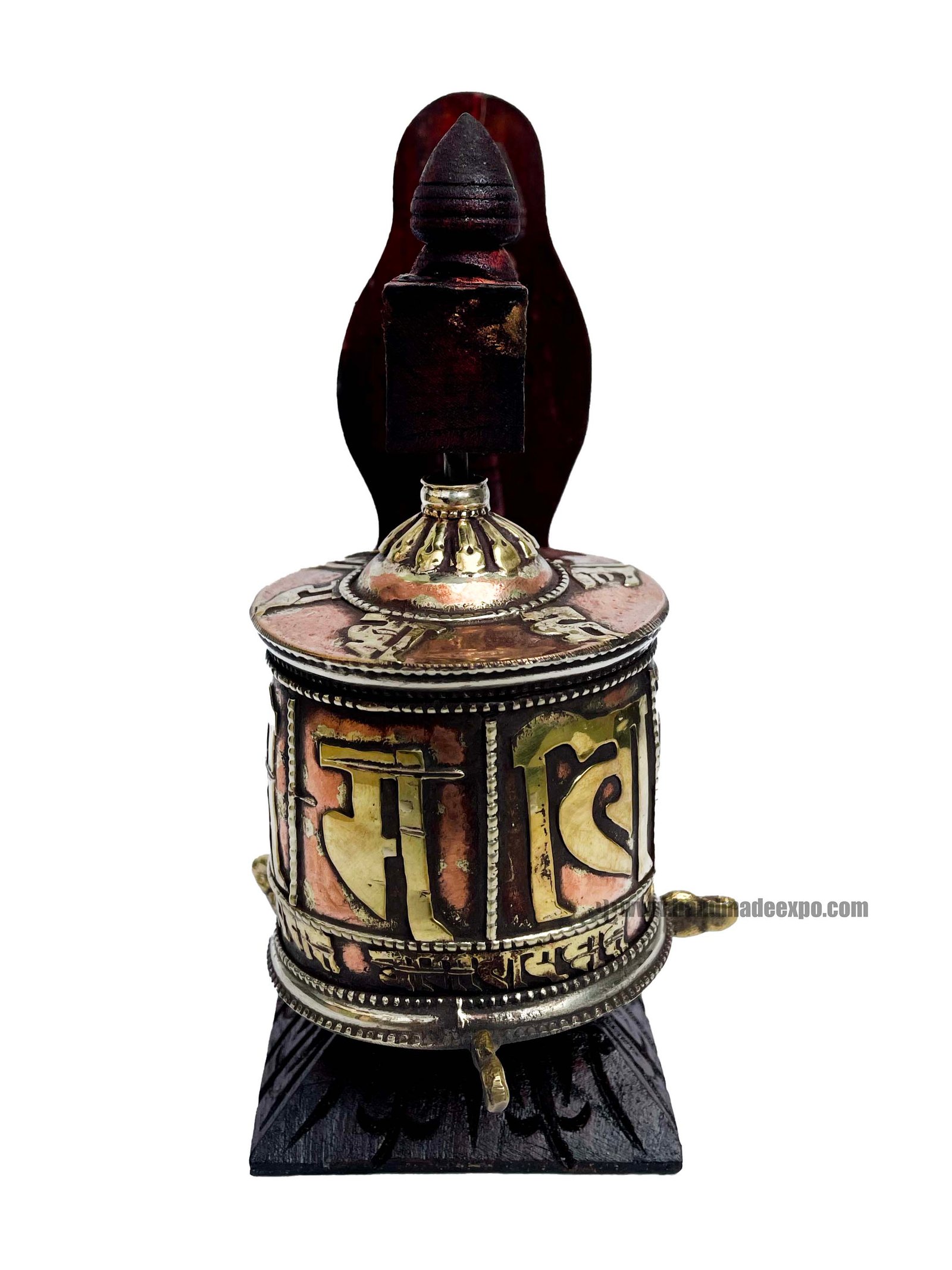 Brass Prayer Wheel On Wooden Frame, with Mantra Inside, Wall Mountable , A wheel containing mantras, used to accumulate merit and spread blessings