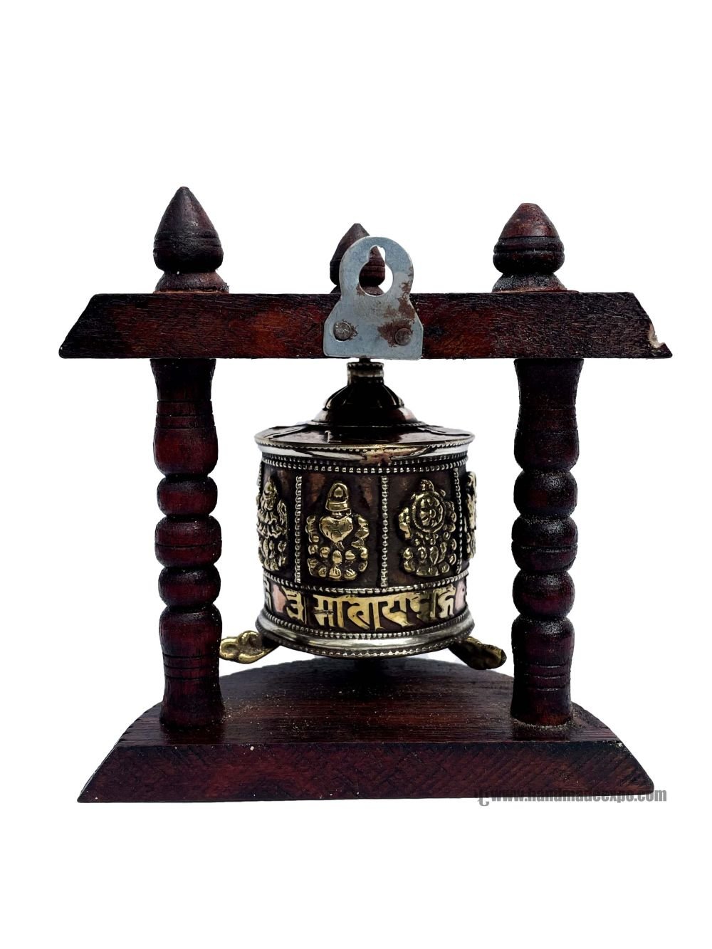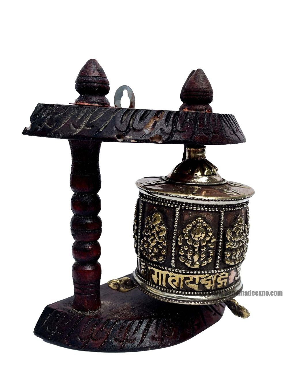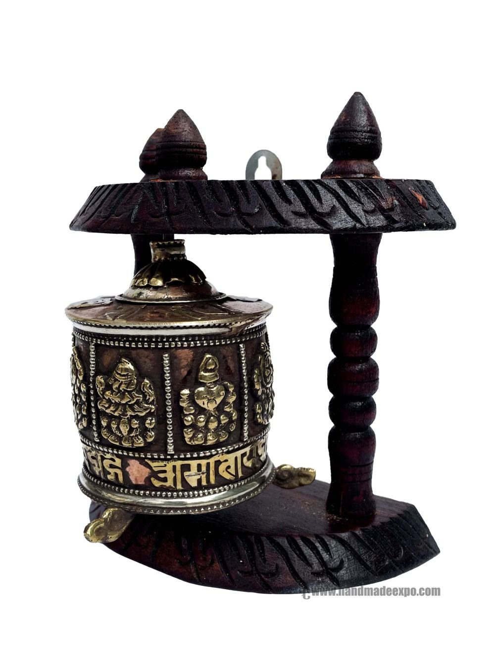 Brass Prayer Wheel On Wooden Frame, with Mantra Inside, Wall Mountable , A wheel containing mantras, used to accumulate merit and spread blessings