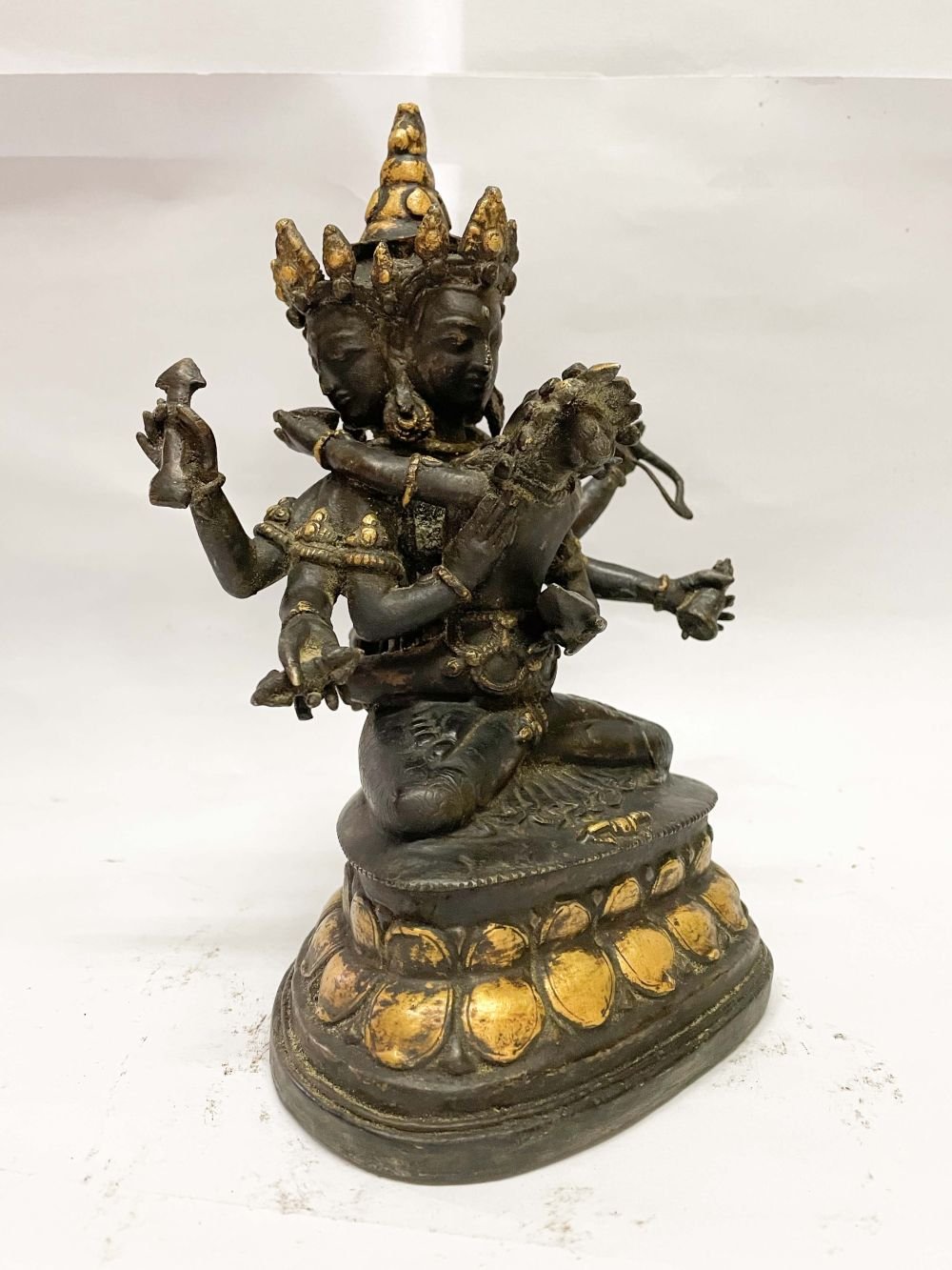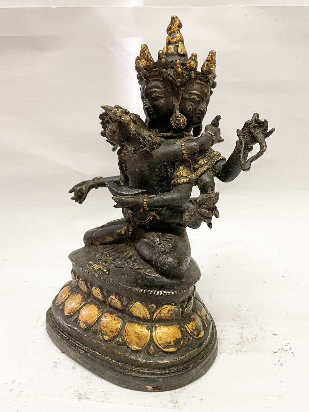 This is an antique patina-finished Guhyasamaja. This is not an antique statue. It is just an antique patina finish. This Guhyasamaja is a testament to the artisan's mastery of the art of aging. Its antique patina has been meticulously crafted to give the appearance of an aged statue, showcasing the artist's unique techniques and skills. Through undisclosed processes and careful aging treatments, the Guhyasamaja undergoes a transformation that captures the essence of time and history. Read More