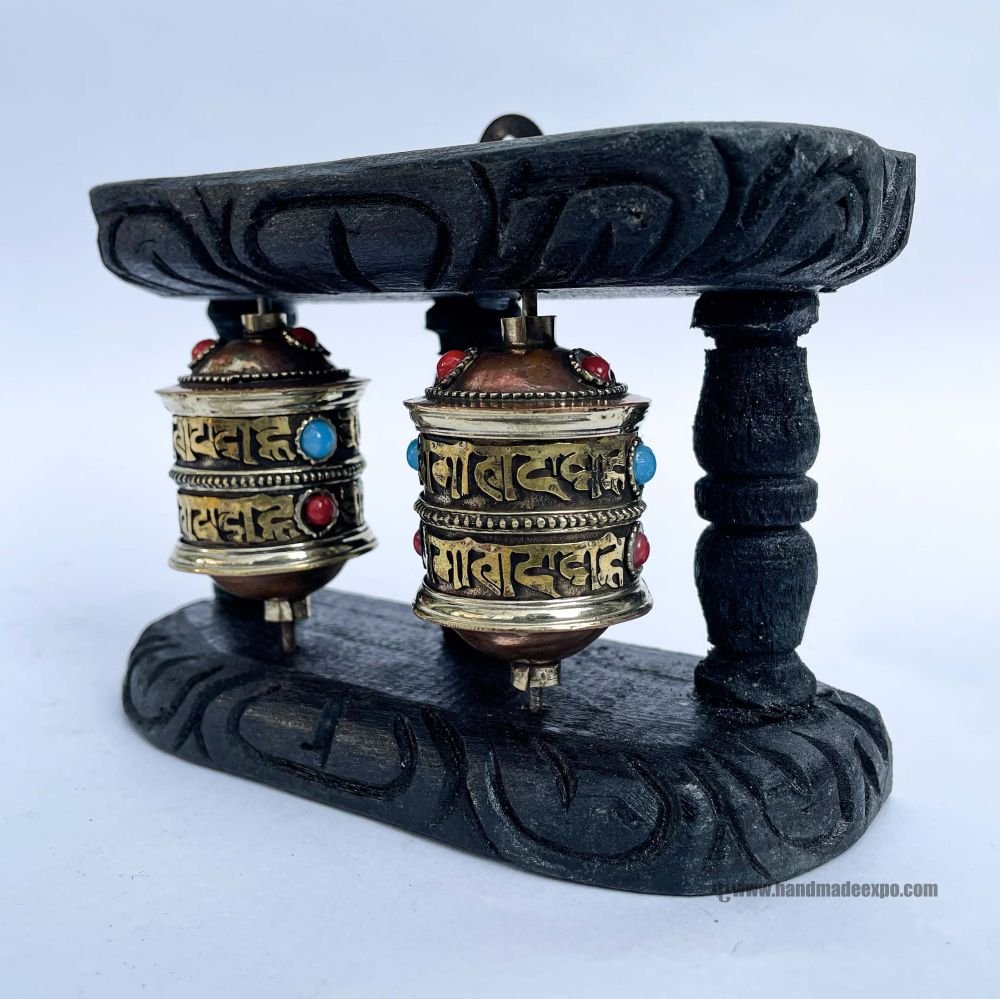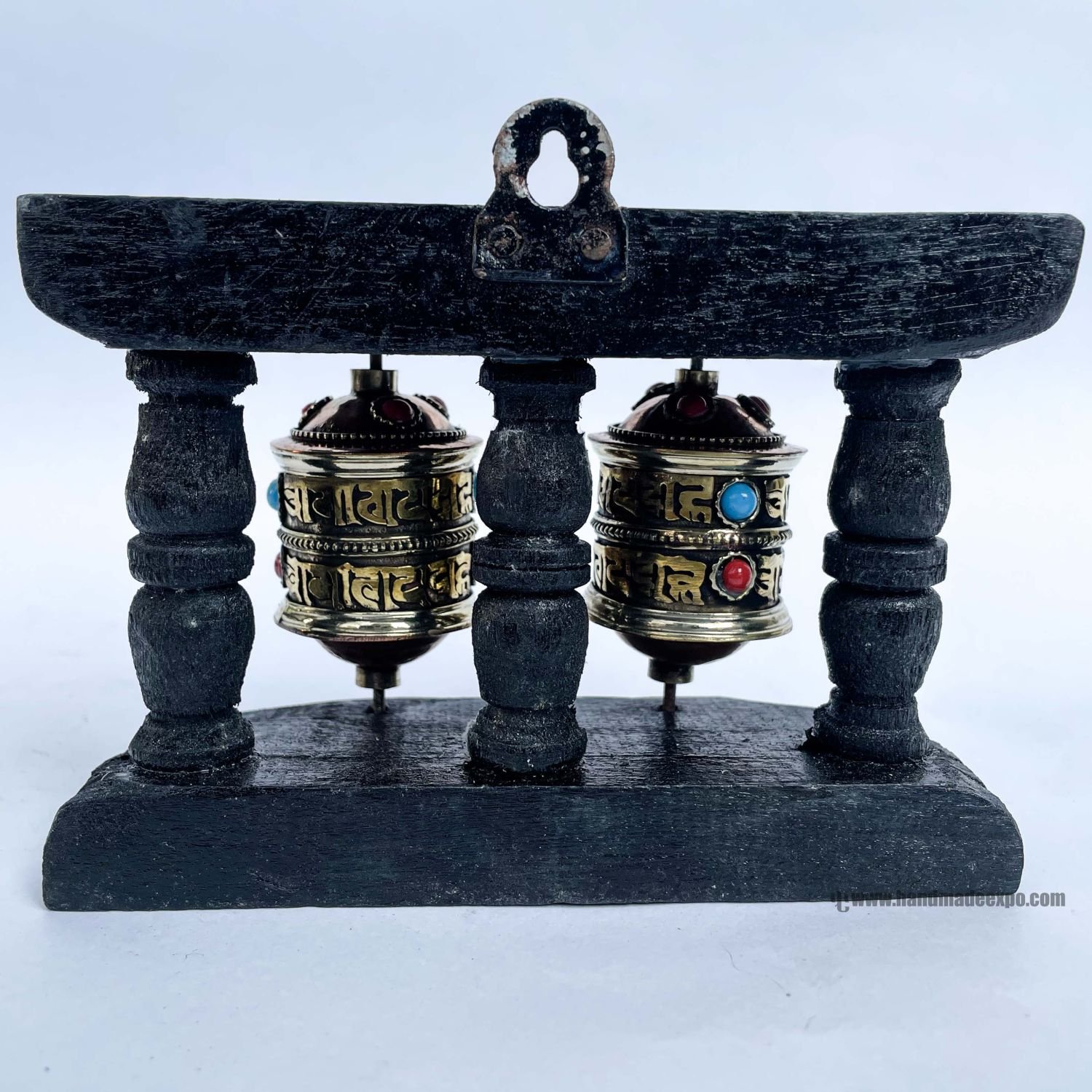 Double Brass Prayer Wheel On Wooden Frame, with Mantra Inside, Wall Mountable , A wheel containing mantras, used to accumulate merit and spread blessings