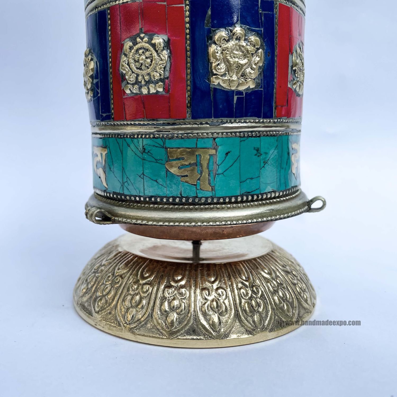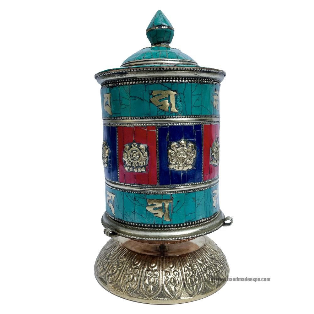 A prayer wheel is a cylindrical wheel on a spindle made from metal, wood, stone, leather, or coarse cotton. Traditionally, the mantra Om Mani Padme Hum is written in the Newari language of Nepal, on the outside of the wheel. Also sometimes depicted are Dakinis, Protectors, and very often the 8 auspicious symbols Ashtamangala. At the core of the cylinder is a "Life Tree" often made of wood or metal with certain mantras written on or wrapped around it. Many thousands (or in the case of larger prayer wheels, millions) of mantras are then wrapped around this life tree. The Mantra Om Mani Padme Hum is most commonly used, but other mantras may be used as well. According to the Tibetan Buddhist tradition based on the lineage texts regarding prayer wheels, spinning such a wheel will have much the same meritorious effect as orally reciting the prayers. Read More