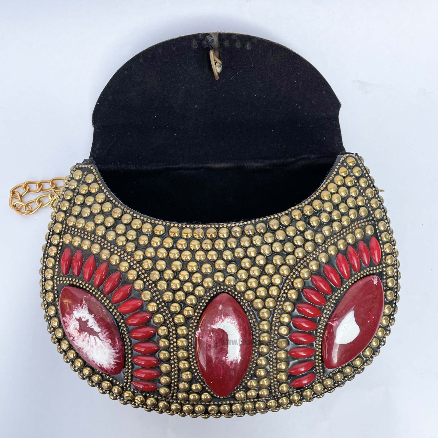 Nepali Handmade Big Ladies Metal Bag with Stone Setting, Golden and Red Color |
