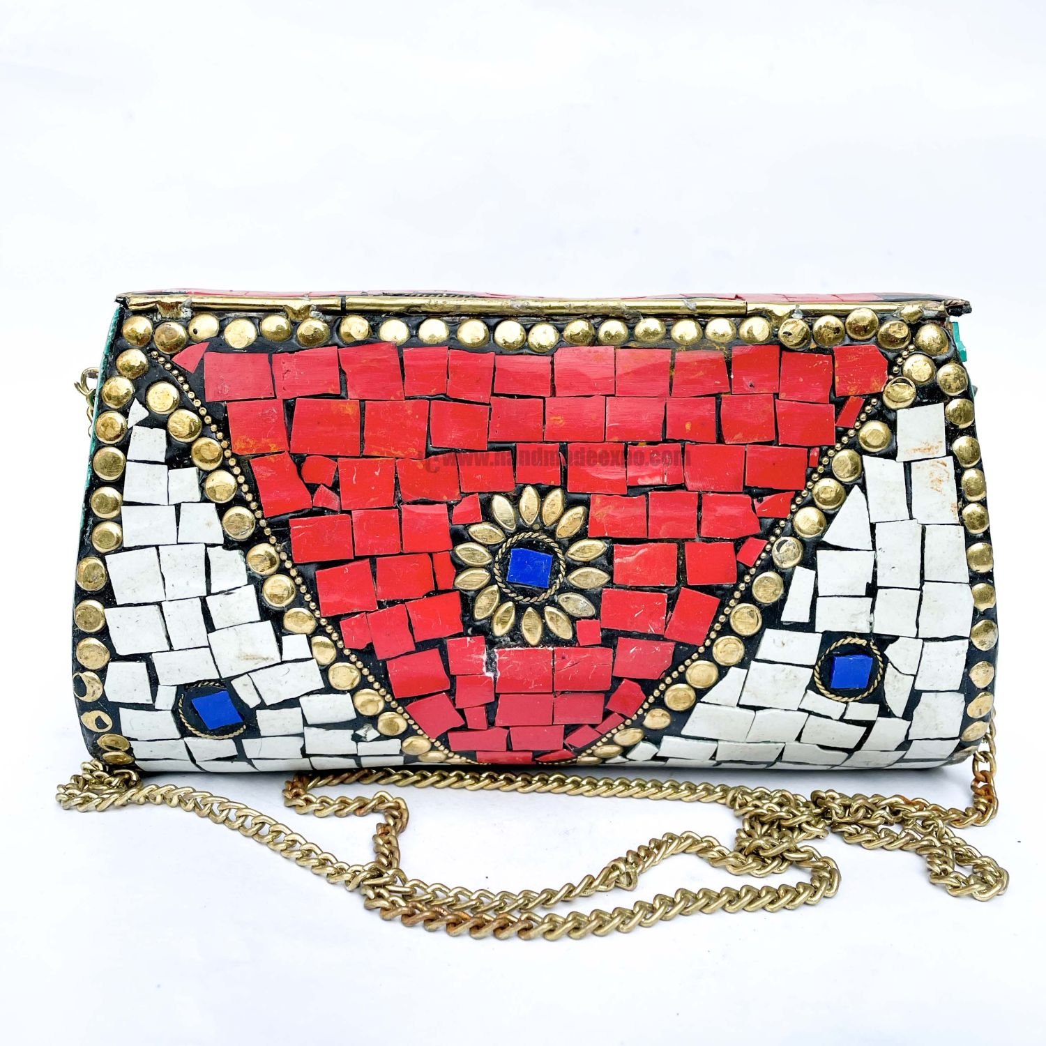 Metal lady's bags with stone settings are a traditional form of Nepali handicrafts that has been around for centuries. These bags are typically made of high-quality metals such as brass, copper, or silver, and are often adorned with colorful stones or gems.