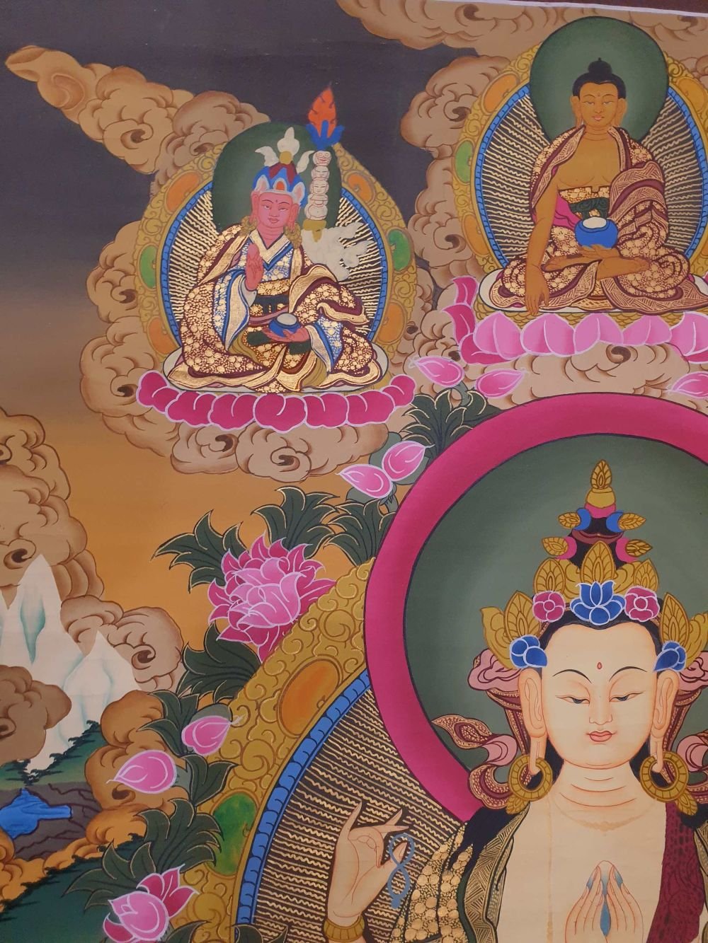 Buddhist Hand Painted Thangka of Chenrezig, Three Great Bodhisattvas , Bodhisattva of Compassion, Protector of All Beings