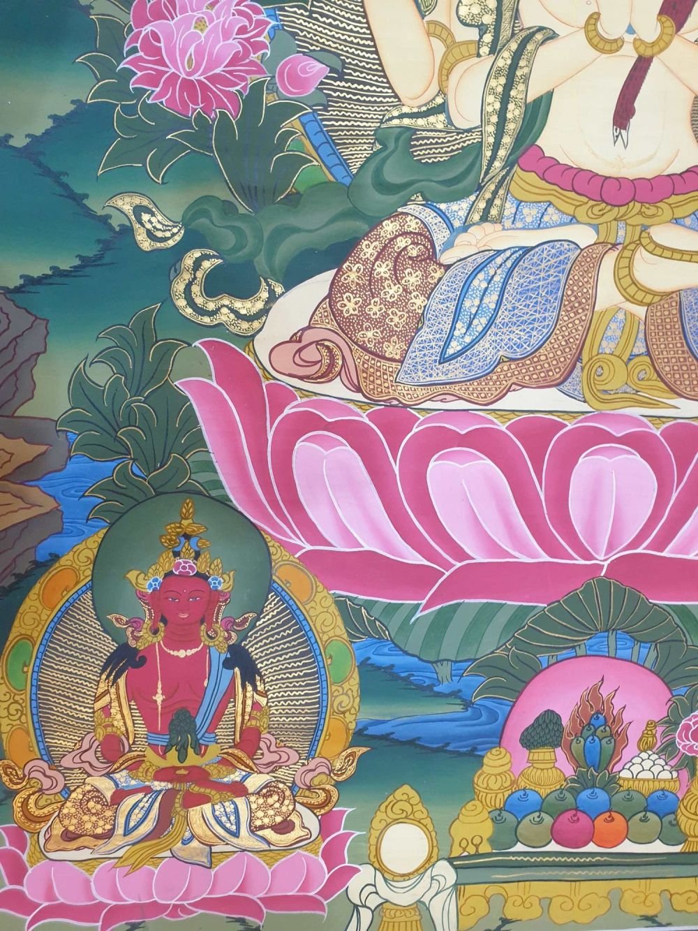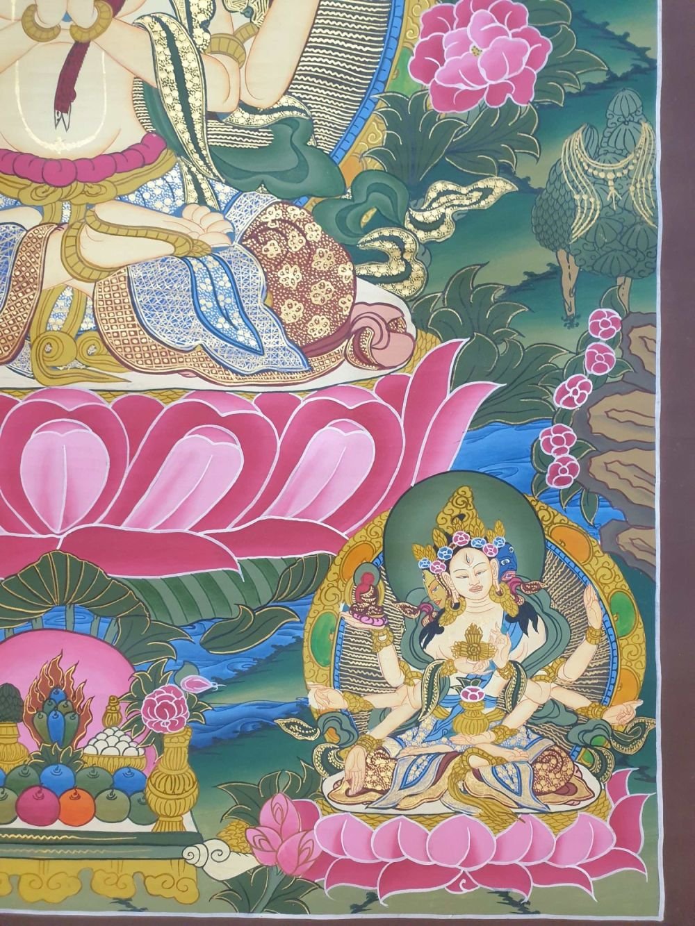 The first two, the inner arms, have palms joined at the heart, holding a sky-blue, and wish fulfilling jewel. This symbolizes that in whatever way Chenrezig manifests to benefit beings, the quality of Chenrezig's mind is never separate from the all-pervasive primal wisdom.