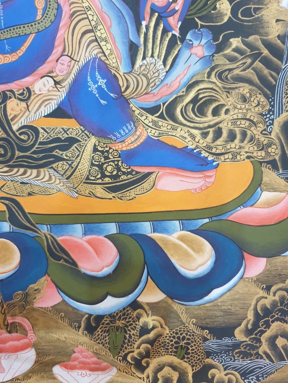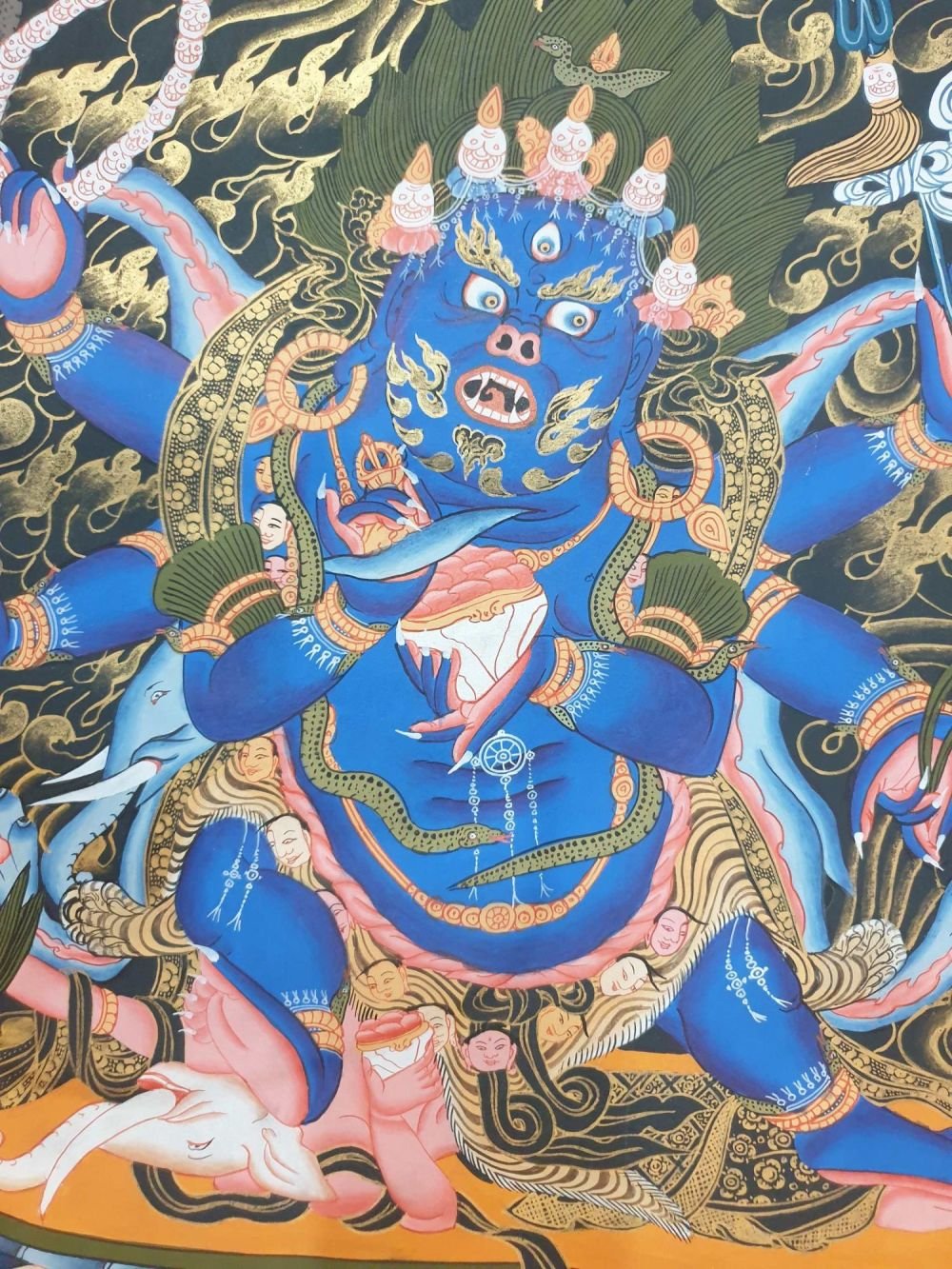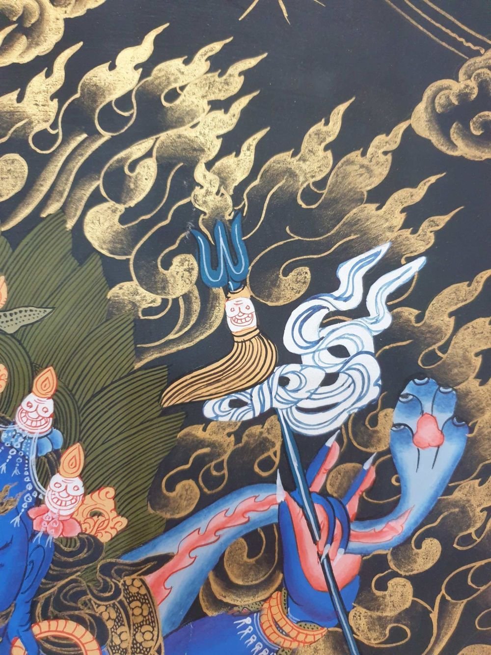 Black Mahakala is typically depicted with a fierce expression, dark blue or black, symbolizing his wrathful nature. He stands on a corpse, representing his triumph over death and impermanence. He has four arms, each holding a symbolic object. His main right hand wields a trident, representing his power over the three poisons of ignorance, attachment, and aversion. In his main left hand, he holds a skull cup filled with blood, symbolizing the transmutation of negative emotions. His remaining two hands hold a curved knife, representing the severance of ignorance, and a lasso, symbolizing the binding of negative forces.