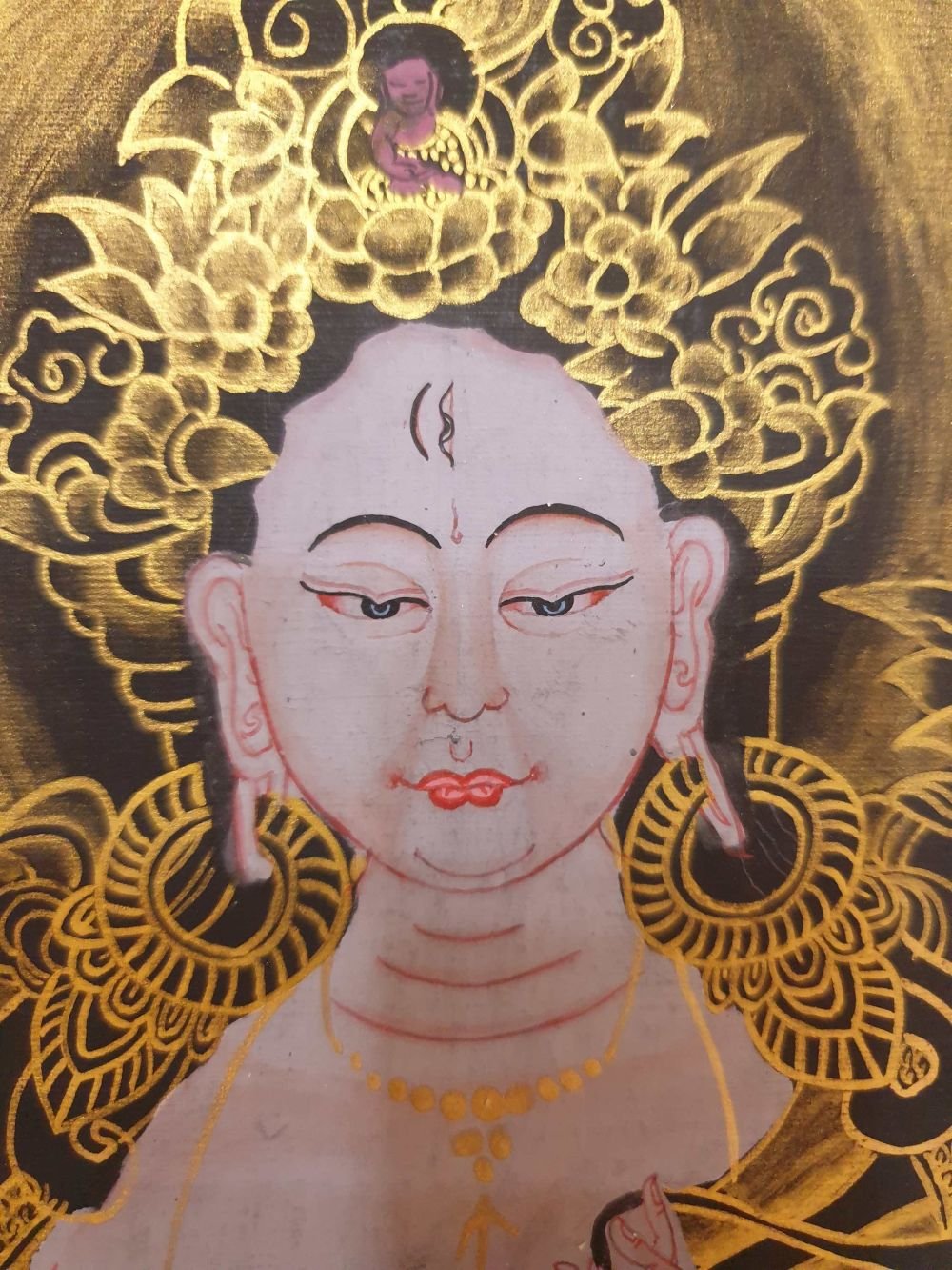 Her left hand is gracefully lowered in an empty open palm boon granting gesture [Skt. Varada Mudra]. White Tara has a blooming pink lotus & an unopened bud on either side of her body. The lotus in the painting is stylised as a peony & a chrysanthemum to provide artistic contrast with her lotus throne. The open blossom represents the present and the bud represents the future situations & Buddhas yet to be born. The future also refers to beneficial changes circumstances that she will help bring about. Her right hand wisdom hand is in the gesture of giving refuge [Skt. Sharanagamana]. The word refuge refers to the teaching of compassionate understanding which she imparts. The third finger touches the thumb to create a circle representing the union of wisdom and compassion, and the three extended fingers symbolise the Three Jewels of Buddhism A. The Buddha State B. The Body of teachings [Skt. Sangha] C. The Principles of the Universal form [Skt. Dharma]. The same hand holds the stem of a blue lotus [Skt. Utpala] representing change. The lower part of the stem below the bend represents the root of the lotus in the mud. The allegory of the Lotus refers to the something that grows from the obscurity of the mud & which eventually bursts open in the light. The lotus journey is one of inner awakening & enlightenment analogous to the human spirit. Buddhism shows us how to grow towards the light with profound teachings which help us to navigate away from burdens and sufferings which we may have by being materially minded, bitter & confused.