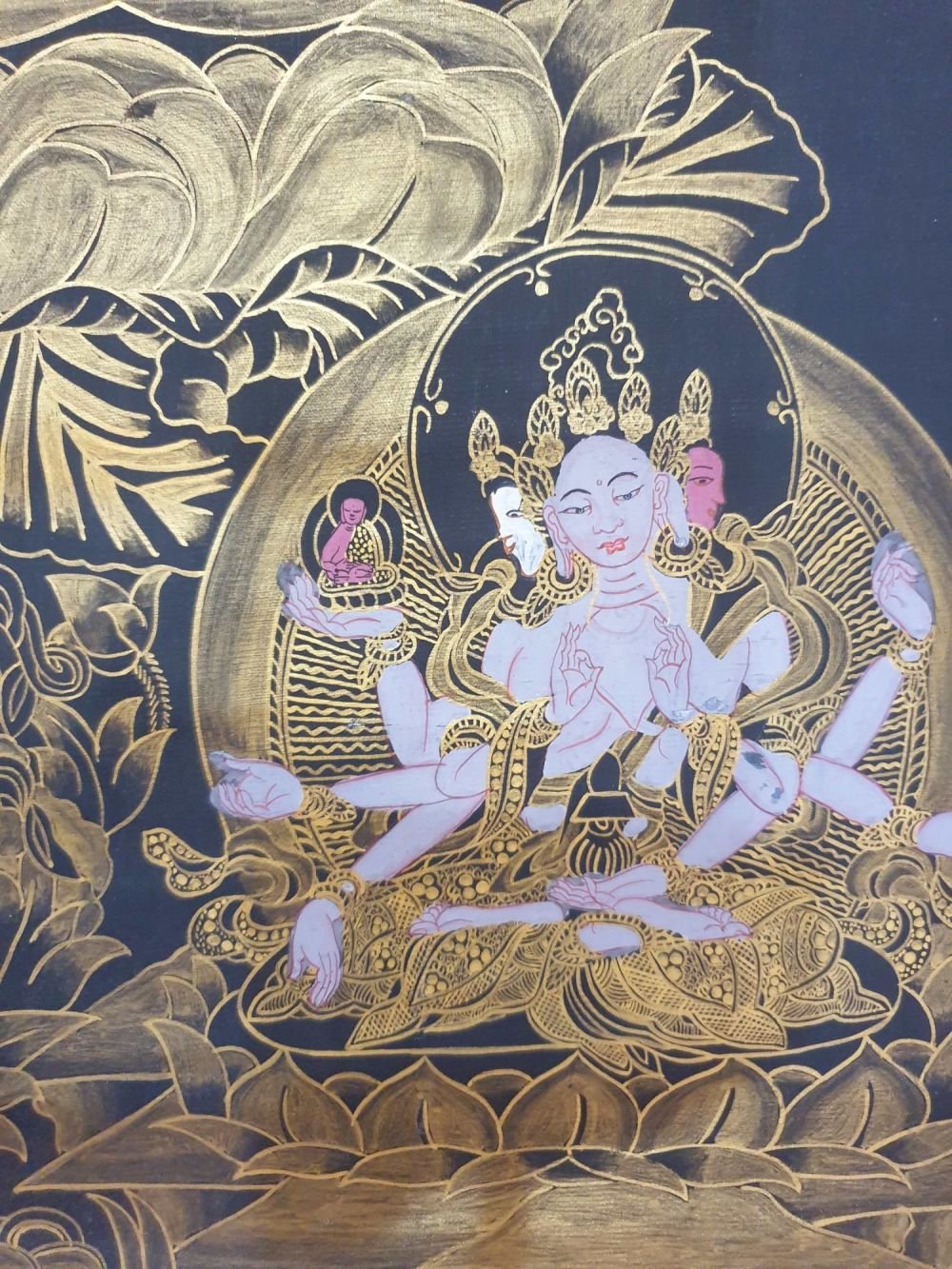 Sita Tara, popularly known as White Tara. She has emanated from Avalokiteshvara & in the Nepali Transcendent Buddha tradition is the consort of Vairochana, the central Transcendent Buddha. Her inner virtue of loving compassion is magnified by the simplicity of her presentation. White Tara is an important Vajrayana Buddhist figure since she embodies the principle of loving kindness, which is the central quality in the altruistic Bodhisattva presented through Mahayana Buddhism. Her main emblem is the Pink Lotus [Skt. Kamala] representing this main quality.