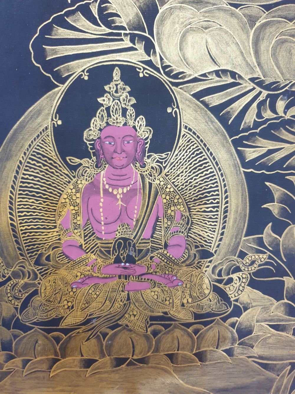 Tara's are difficult to place being neither Deity nor Dakini. Tara's are commonly described as female emanations and aides of Buddhas. Deities tend to have consorts with whom they are having sexual intercourse. She has a special association with the Pink lotus which represents the arising of wisdom from the obscure depths of the mud and the flowering of the awoken wisdom. The mud symbolised the primeval state. As with the other emanations of Tara, she has come into being from the teardrop of Avalokateshwara the great Bodhisattva of compassion.