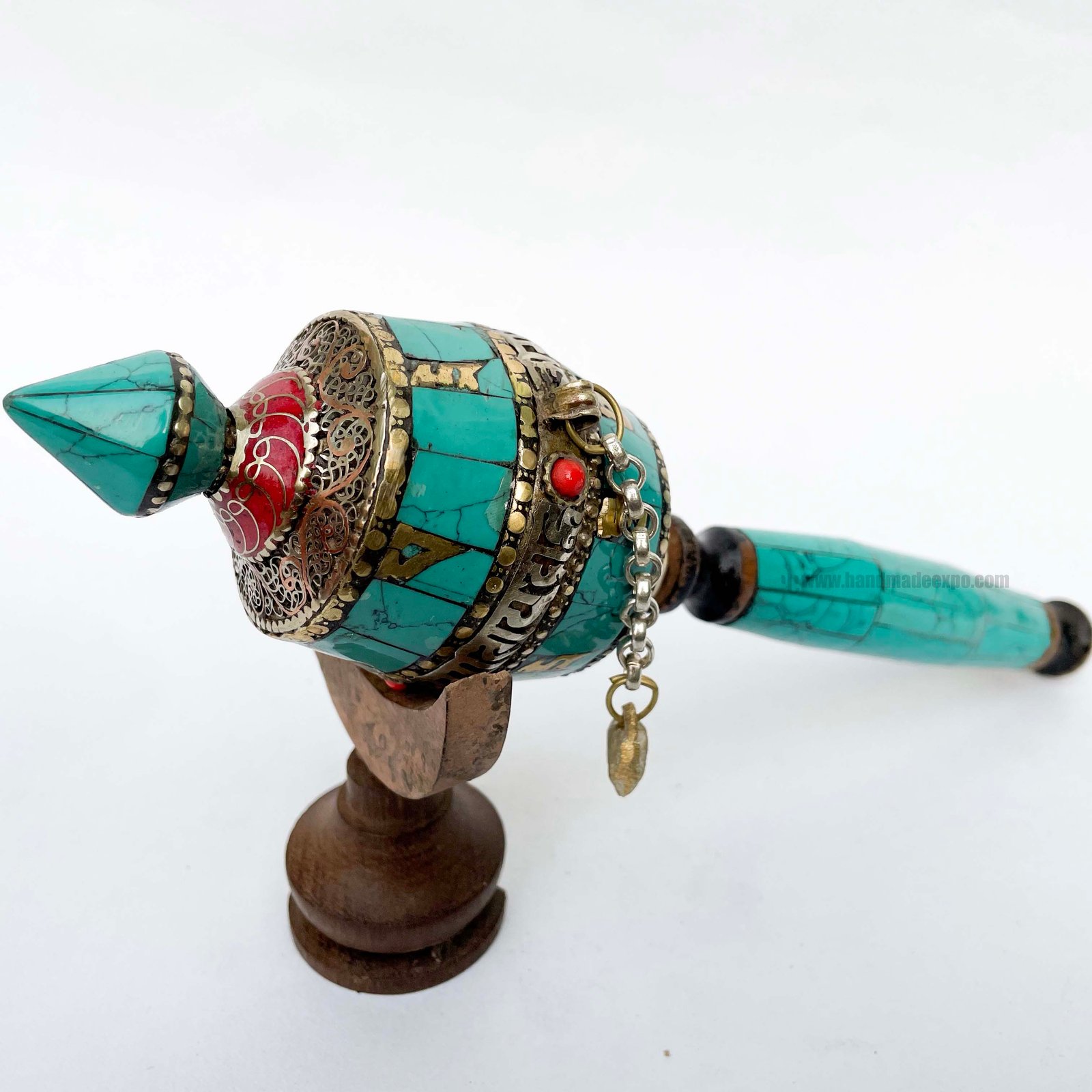 Brass Hand Held with Mantra Prayer Wheel, Stone Setting, Blue and Red Color , A wheel containing mantras, used to accumulate merit and spread blessings