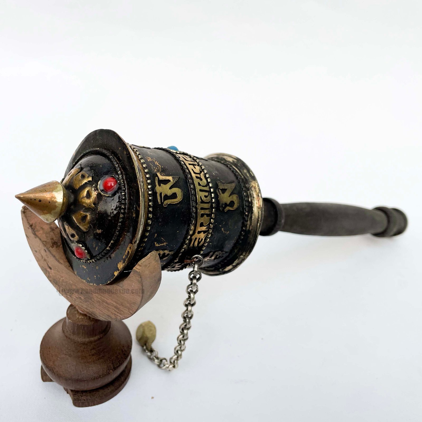 Brass Hand Held with Mantra Prayer Wheel, Stone Setting, Black Color , A wheel containing mantras, used to accumulate merit and spread blessings