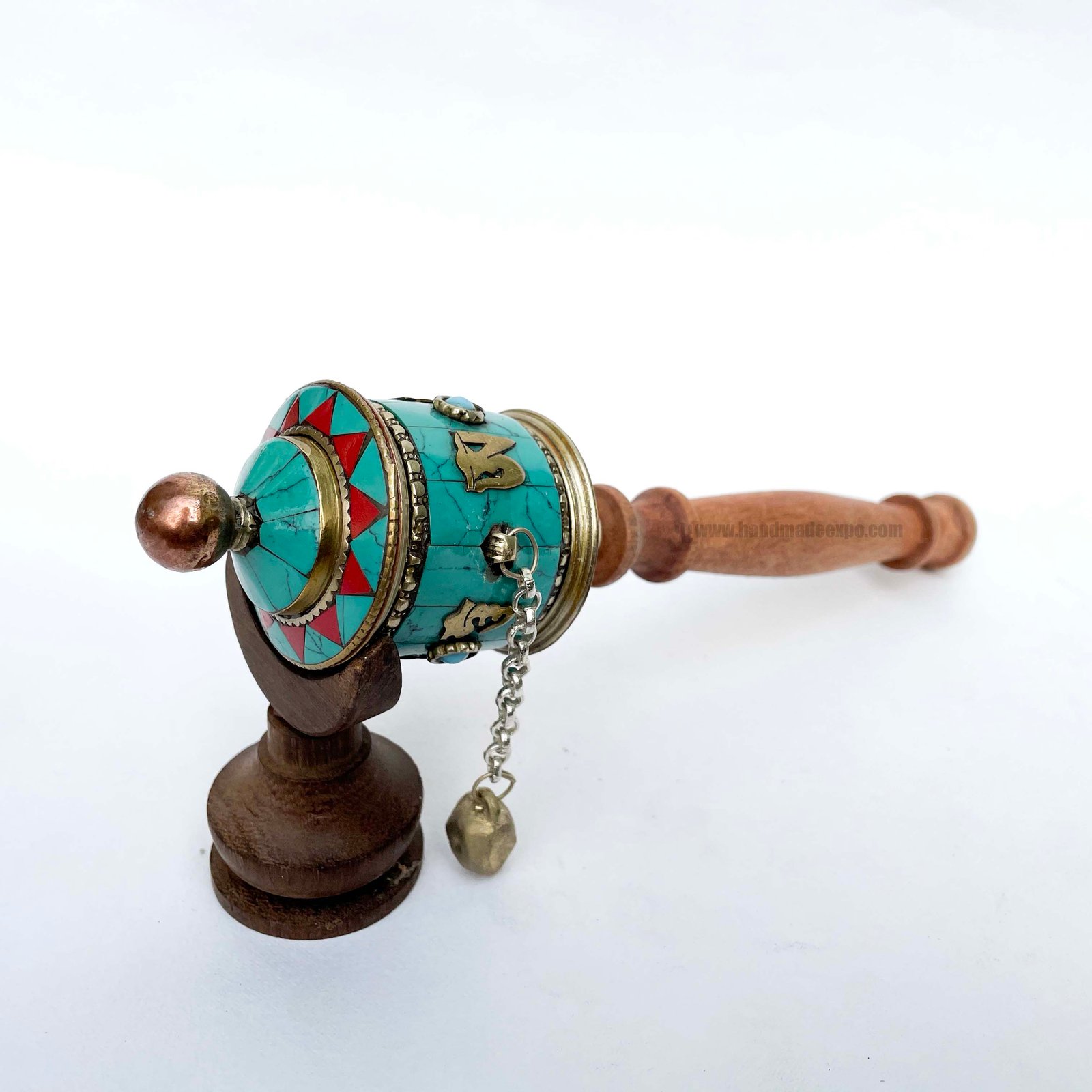 Sikku Brass Hand Held with Mantra Prayer Wheel, Stone Setting, Blue Color , A wheel containing mantras, used to accumulate merit and spread blessings
