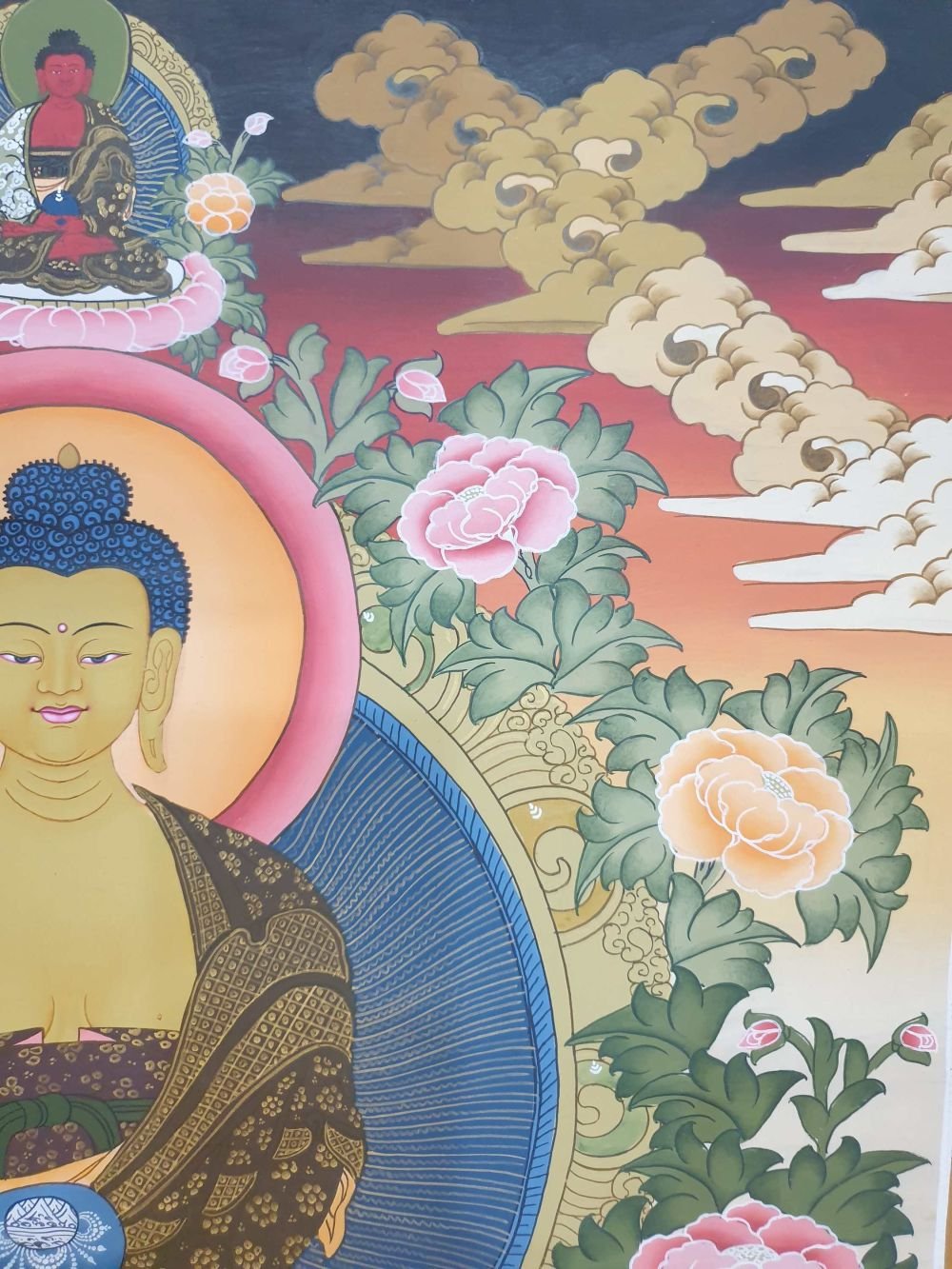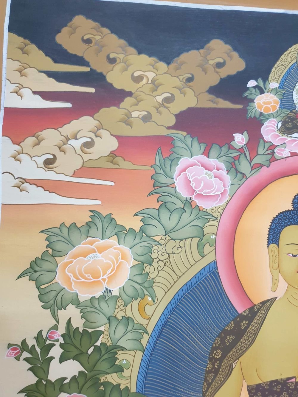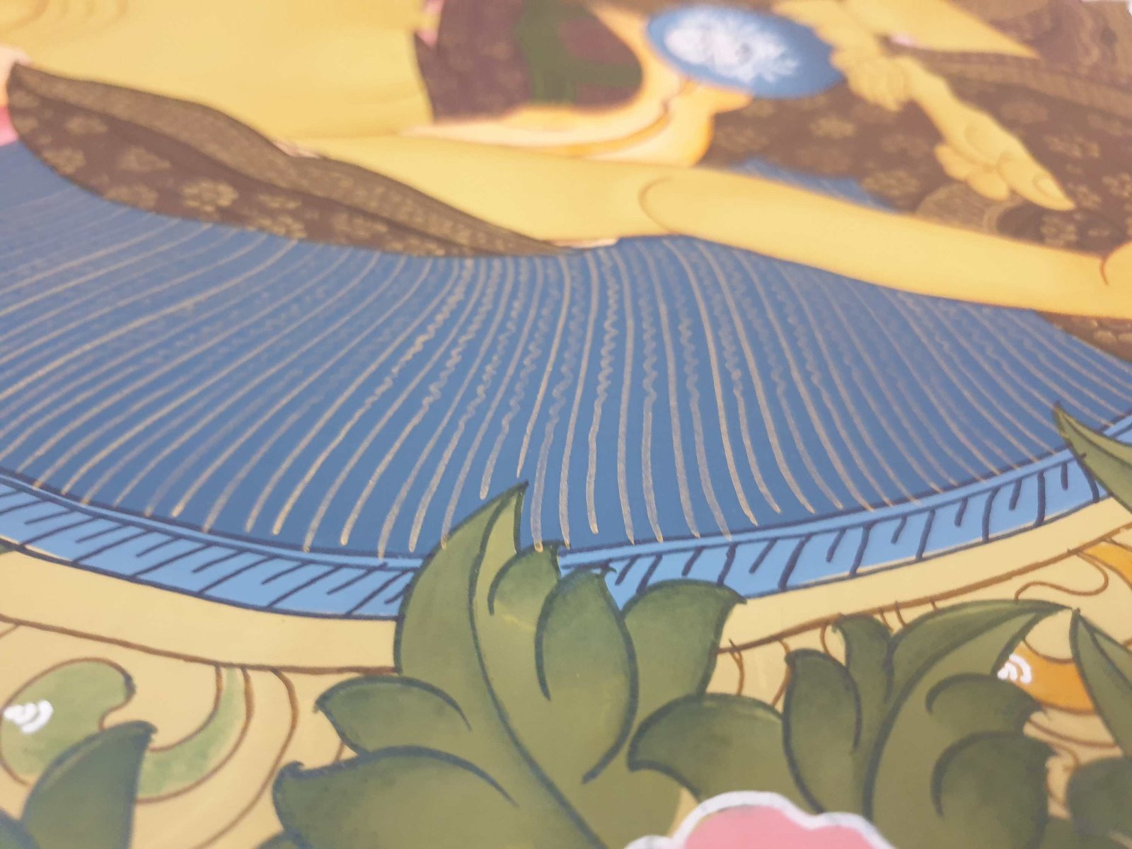 This thangka of Shakyamuni Buddha has real gold painted on its surface along with other paints. This is an ancient process of decorating the thangka in Tibetan Buddhism, Here gold is ground into gold dust, which is then mixed with other undisclosed material to make it paintable on the canvas. this mixture is then mixed with transparent glue and painted on the thangka. Read More