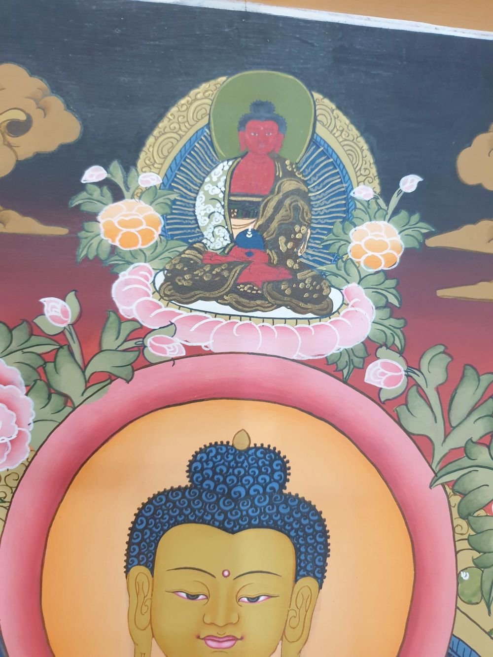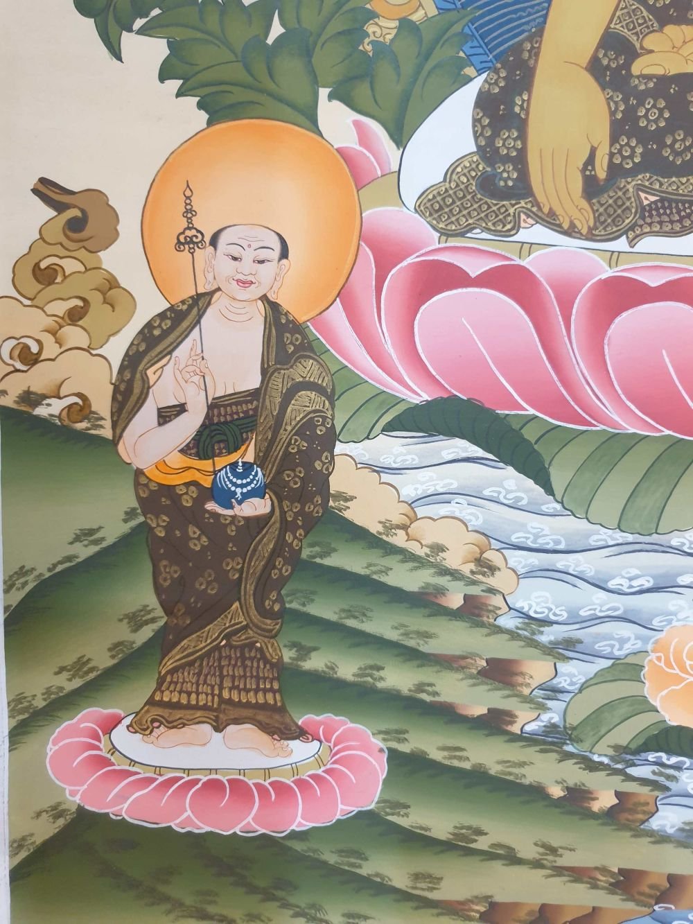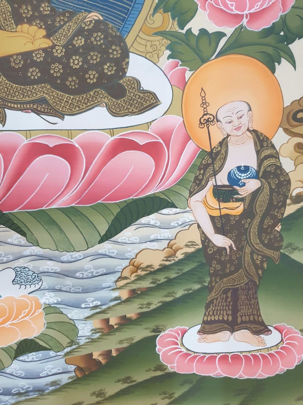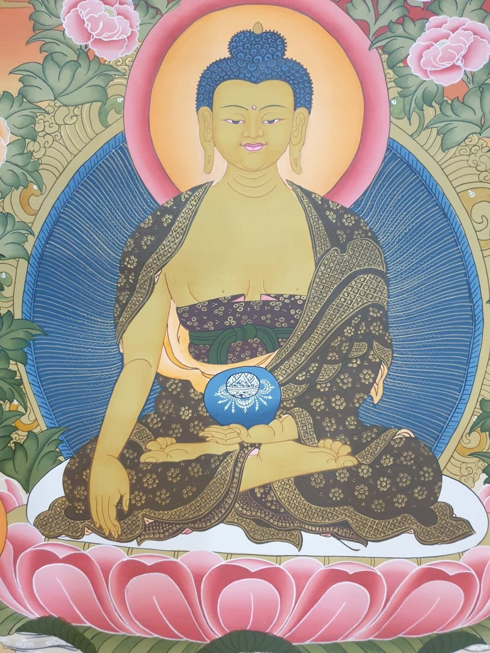 This thangka of Shakyamuni Buddha has real gold painted on its surface along with other paints. This is an ancient process of decorating the thangka in Tibetan Buddhism, Here gold is ground into gold dust, which is then mixed with other undisclosed material to make it paintable on the canvas. this mixture is then mixed with transparent glue and painted on the thangka. Read More