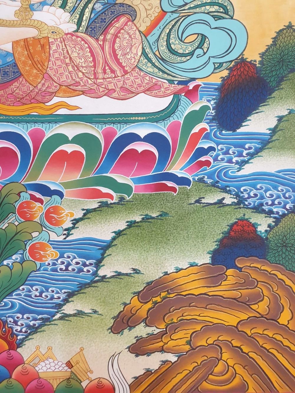 This thangka of Vajrasattva has real gold painted on its surface along with other paints. This is an ancient process of decorating the thangka in Tibetan Buddhism, Here gold is ground into gold dust, which is then mixed with other undisclosed material to make it paintable on the canvas. this mixture is then mixed with transparent glue and painted on the thangka. Read More