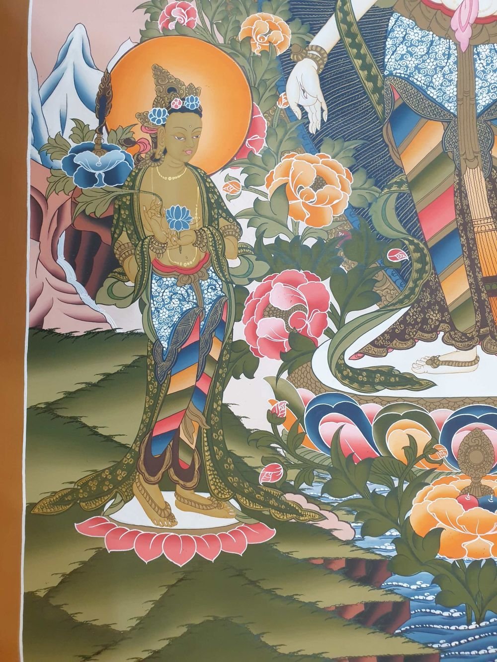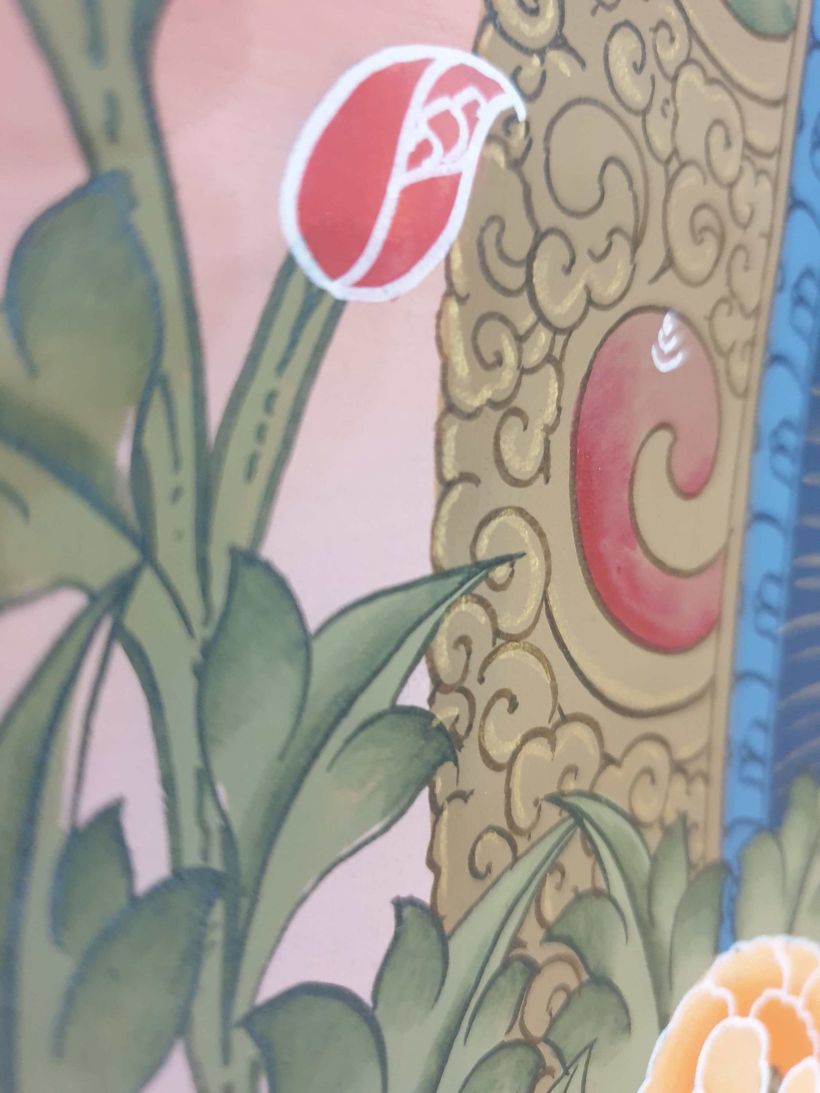 This thangka of White Tara has real gold painted on its surface along with other paints. This is an ancient process of decorating the thangka in Tibetan Buddhism, Here gold is ground into gold dust, which is then mixed with other undisclosed material to make it paintable on the canvas. this mixture is then mixed with transparent glue and painted on the thangka. Read More