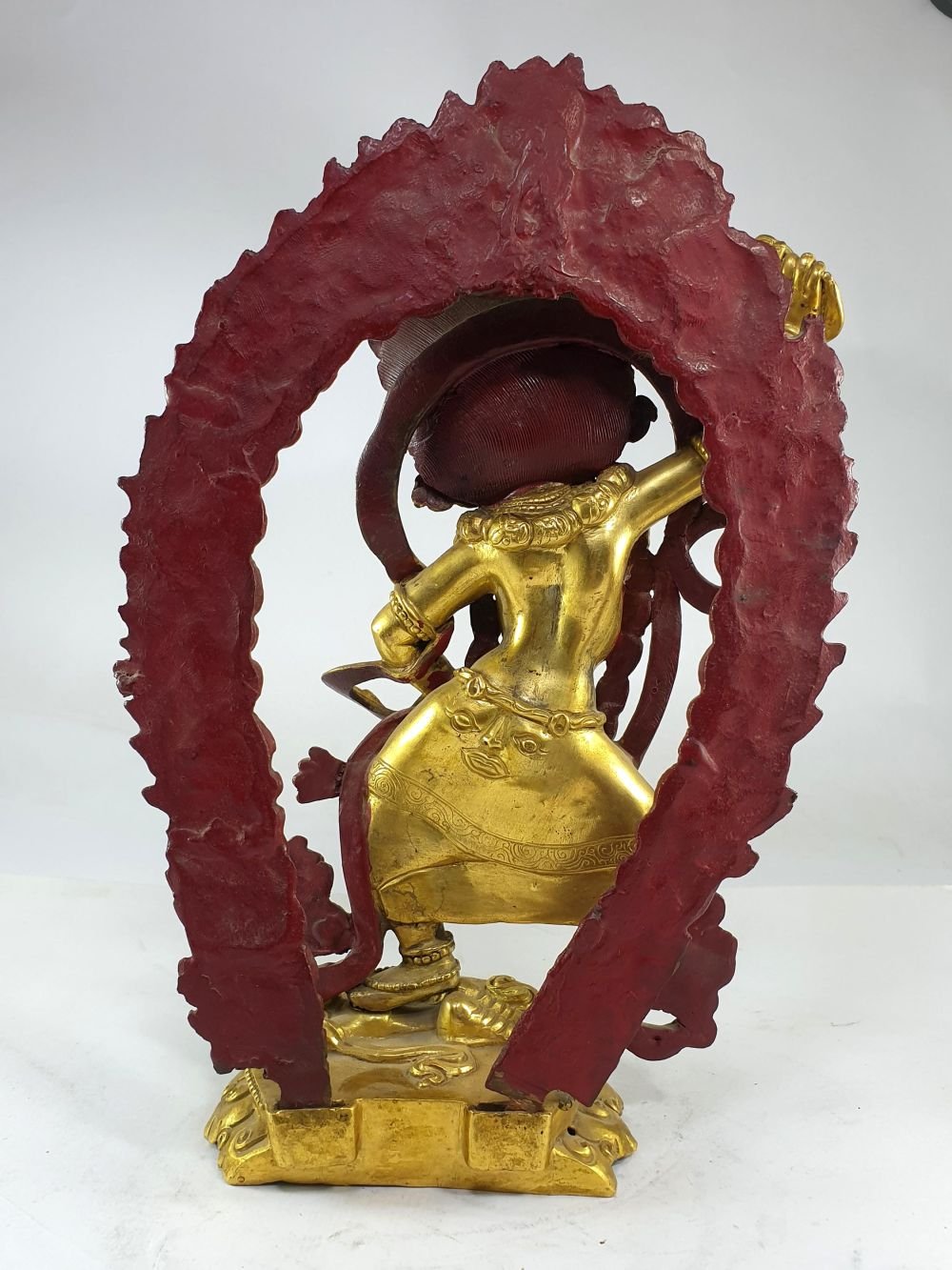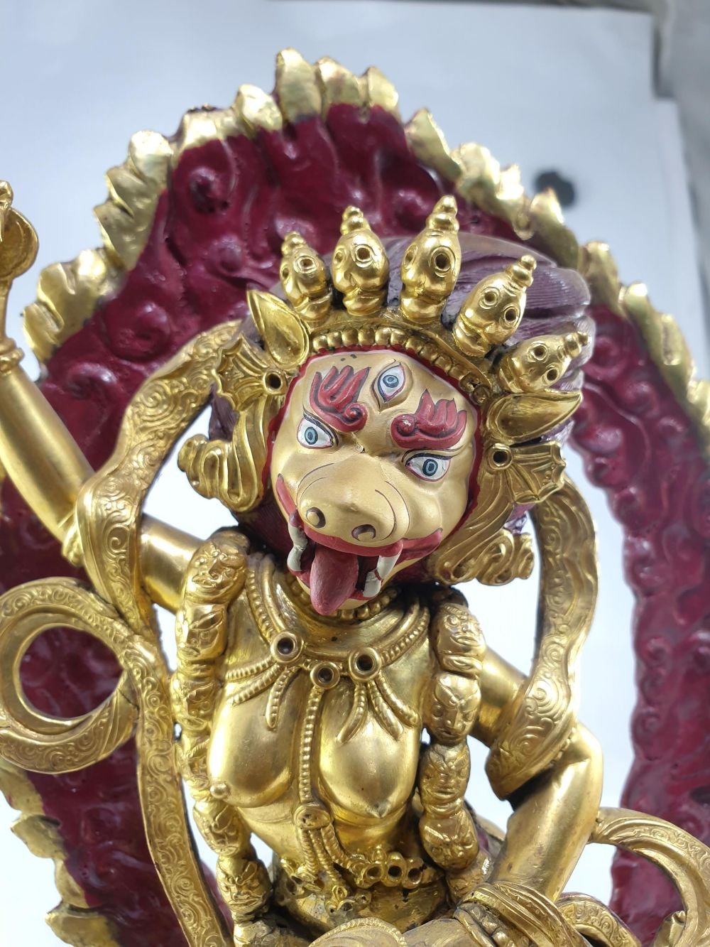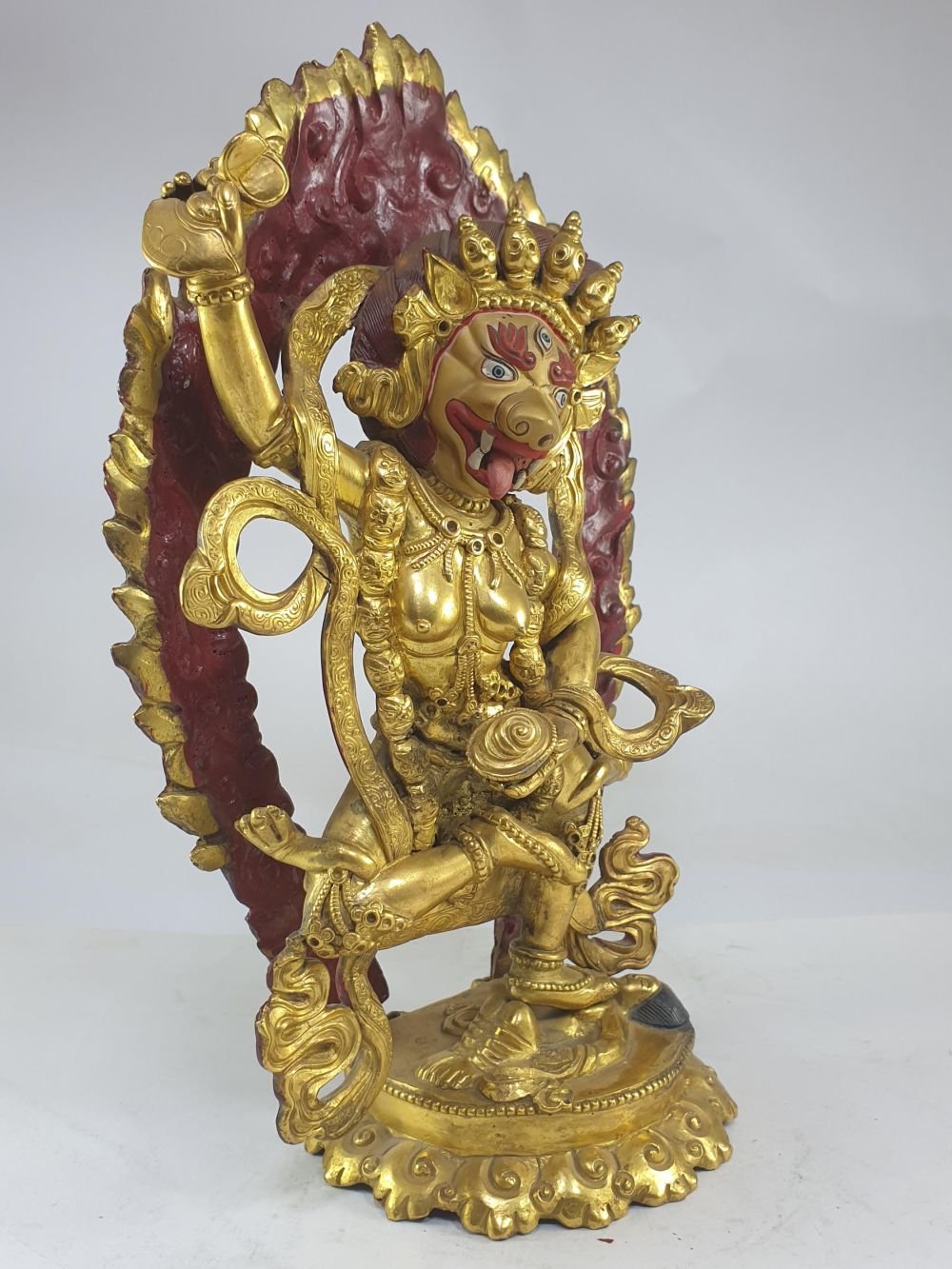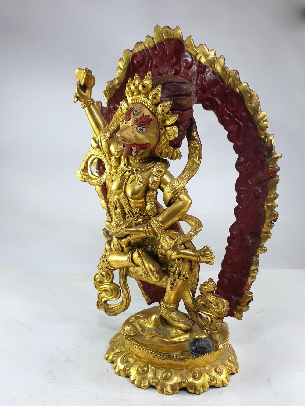 Buddhist Statue of Simhamukha Yogini, Senge Dongma, Full Fire Gold Plated, Painted Face, Old Stock, Rare Find , Fierce Protector and Obstacle Remover