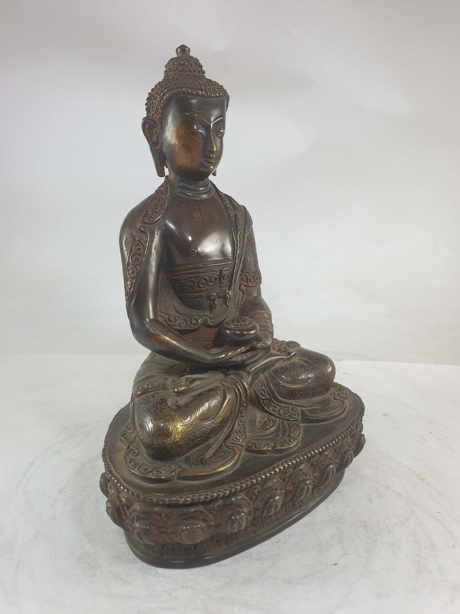 This Amitabha Buddha has been meticulously treated with a chocolate color antique patina. The intention behind this patina is to replicate the appearance of a copper statue that has gracefully aged over a century. Unlike a simple coat of paint, this patina is not applied superficially and is designed to endure. It undergoes an artificial oxidation process that adds depth and character, while also serving as a protective layer against natural oxidation.