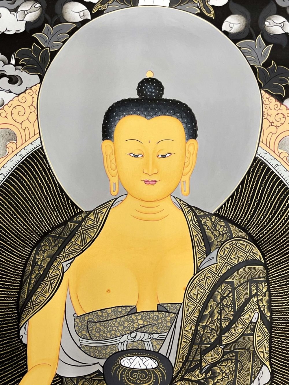 Gautama is painted with golden skin sitting in a lotus seat [Skt. Padmasana] also called the meditative seat [Skt. Dhyanasana] & upon a white moon disc which represents the male principle of method which itself is upon a lotus throne. His left hand touches the ground in what is called bhumisparse mudra which symbolises his own recognition of enlightened mind in one of the most iconic images in all Buddhism. The palm always faces inwards. His feet are deliberately drawn level with one another & enlarged, being specific marks of a Buddha. His right hand supports an alms bowl [Skt. Patra], containing the liquid elixir of eternal life. Somehow the simple image of the bowl reflects his overwhelming humility & kindness. He wears the traditionally maroon gold monk's patched robe [Skt. Samghati] made of twenty five pieces of cloth which the first Buddhist monks sewed together. The Buddha has a green nimbus and blue aureole around his body signifying the highest level of understanding. Siddhartha is surrounded by Pink Lotuses [Skt. Padma]. This kind of lotus is connected with loving kindness & a flowering of pure consciousness. The closed bud to his right side represents the past or originating mind, the blooming flower represents the present & the buds represents the future Buddha Maitreya and forthcoming realisations. His elongated earlobes depict his royal connection; his knotted black hair & topknot symbolise his abandonment of worldly possessions; the dot [Skt. Urna] on his brow on the command chakra [Skt. Ajna] represents his transcendent wisdom, the 31st mark of a Buddha.