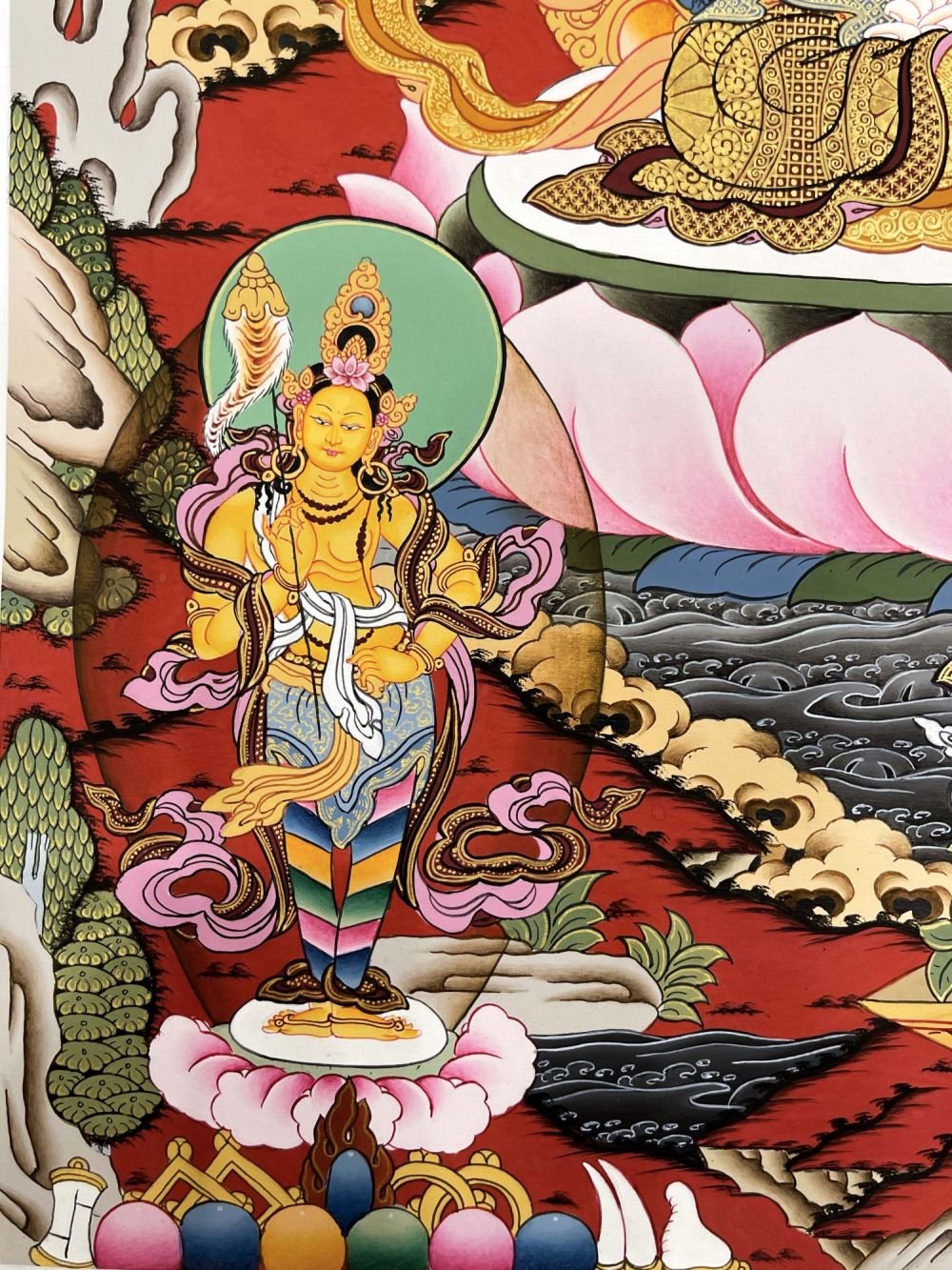 This thangka of Chenrezig has real gold painted on its surface along with other paints. This is an ancient process of decorating the thangka in Tibetan Buddhism, Here gold is ground into gold dust, which is then mixed with other undisclosed material to make it paintable on the canvas. this mixture is then mixed with transparent glue and painted on the thangka. Read More