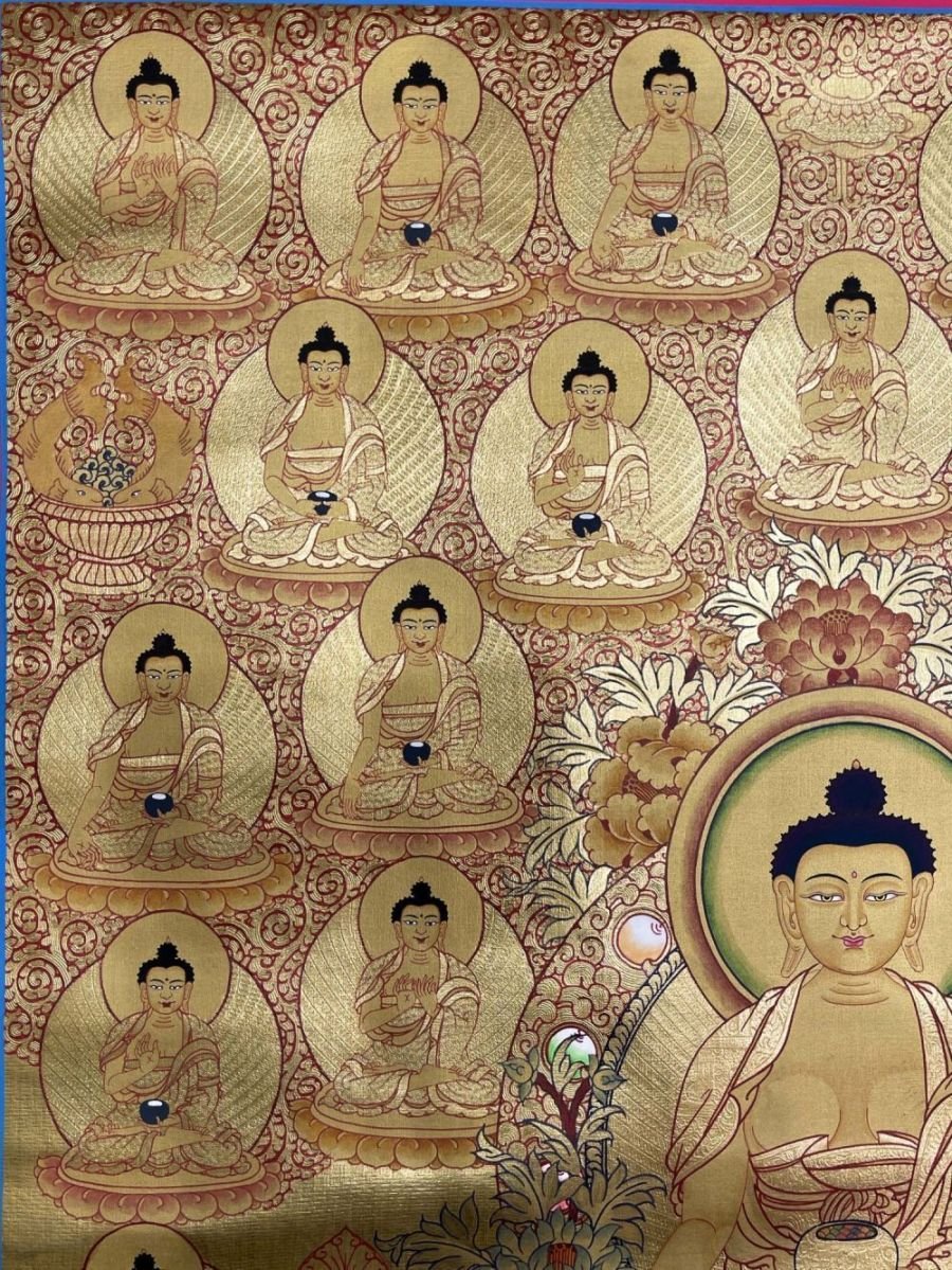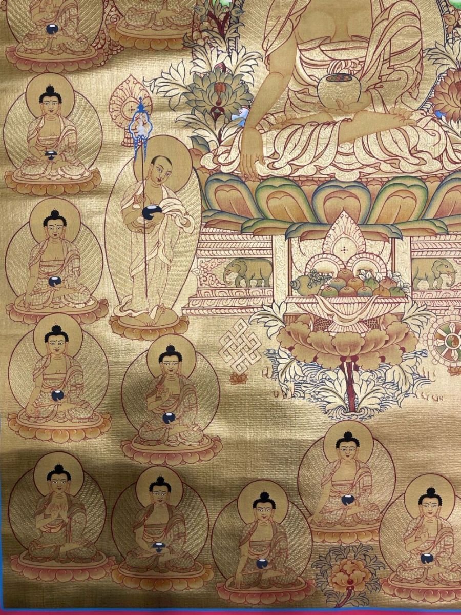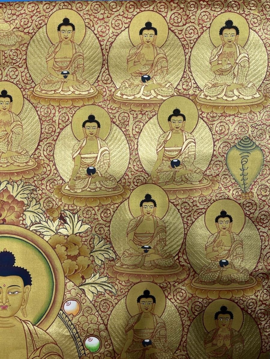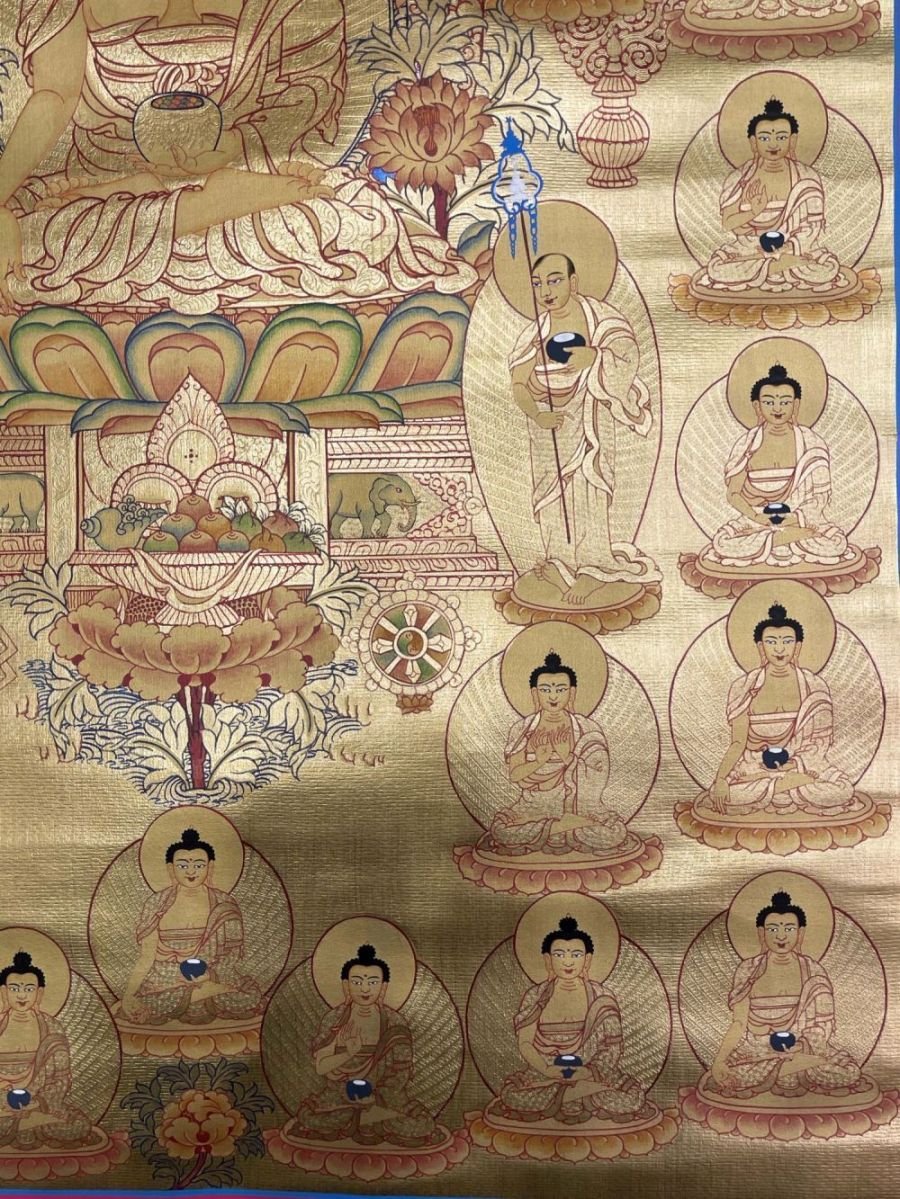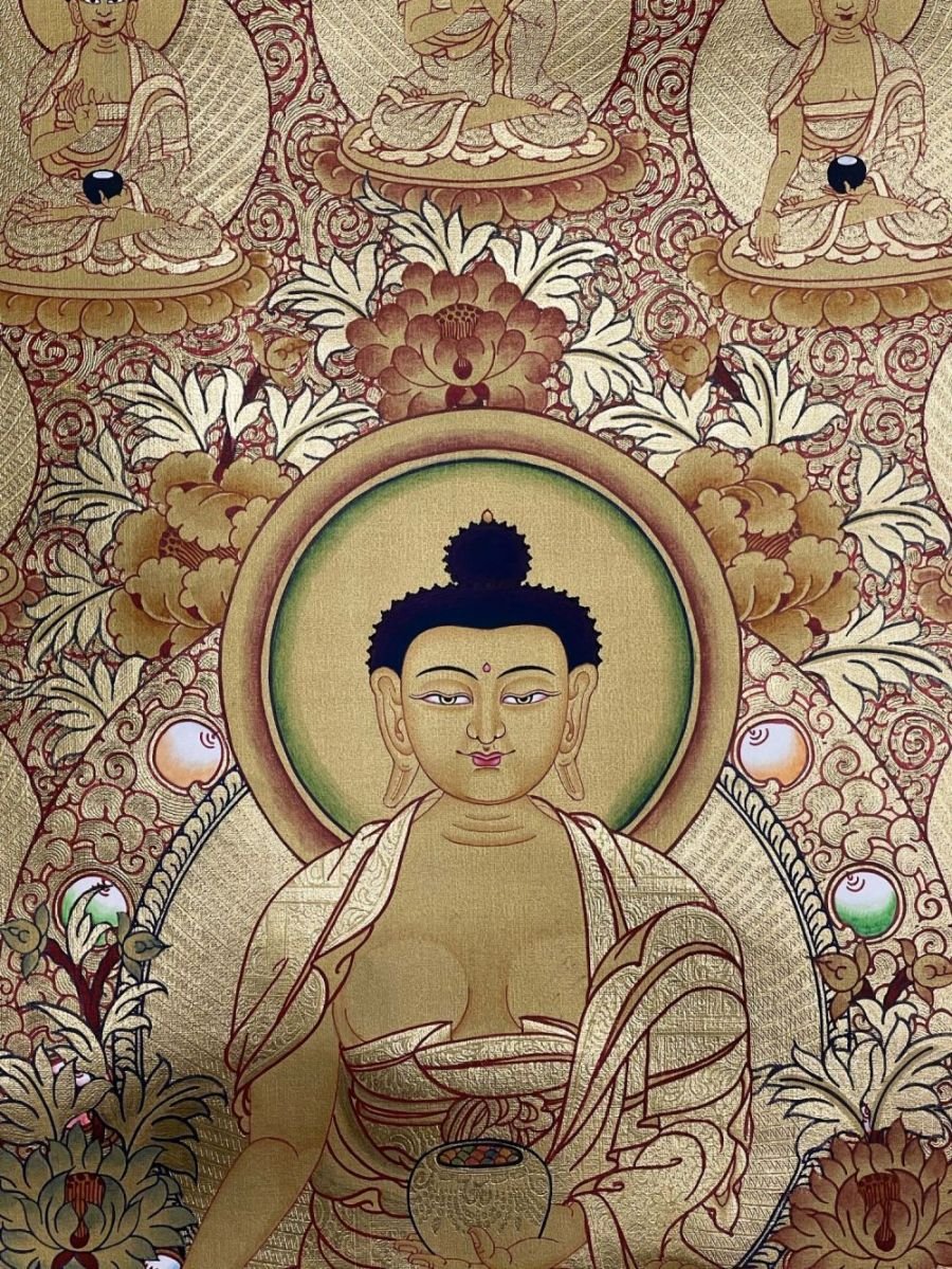 This thangka of Shakyamuni Buddha has real gold painted on its surface along with other paints. This is an ancient process of decorating the thangka in Tibetan Buddhism, Here gold is ground into gold dust, which is then mixed with other undisclosed material to make it paintable on the canvas. this mixture is then mixed with transparent glue and painted on the thangka. Read More