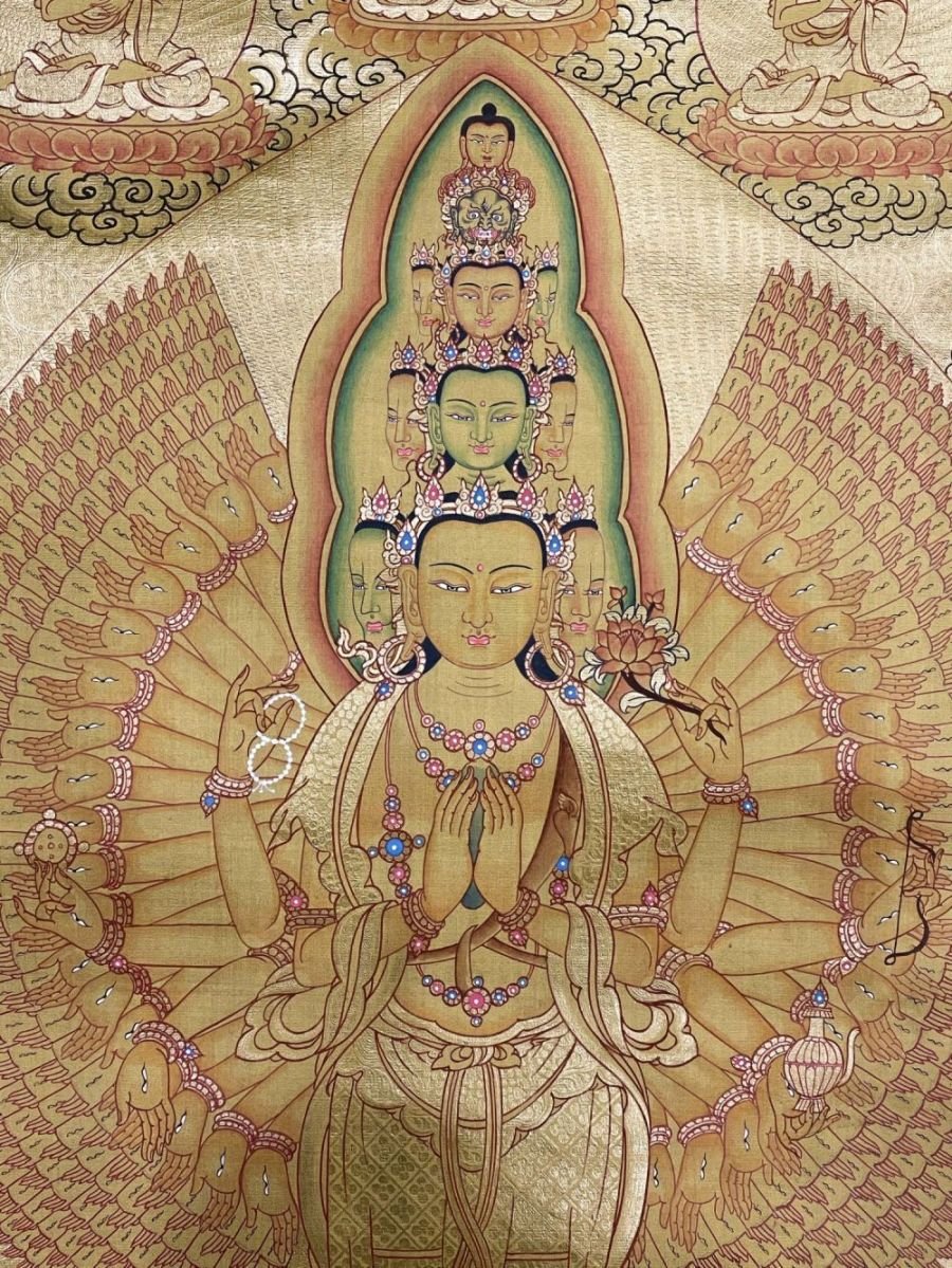 Sahasrabhuja Avalokiteshvara the Thousand-Armed, Thousand-Eyed form of Avalokiteshvara, the Bodhisattva of Infinite Compassion. Each of the 1,000 hands represents his boundless ability to help all sentient beings, while the eye in each palm symbolizes wisdom and omnipresent awareness.