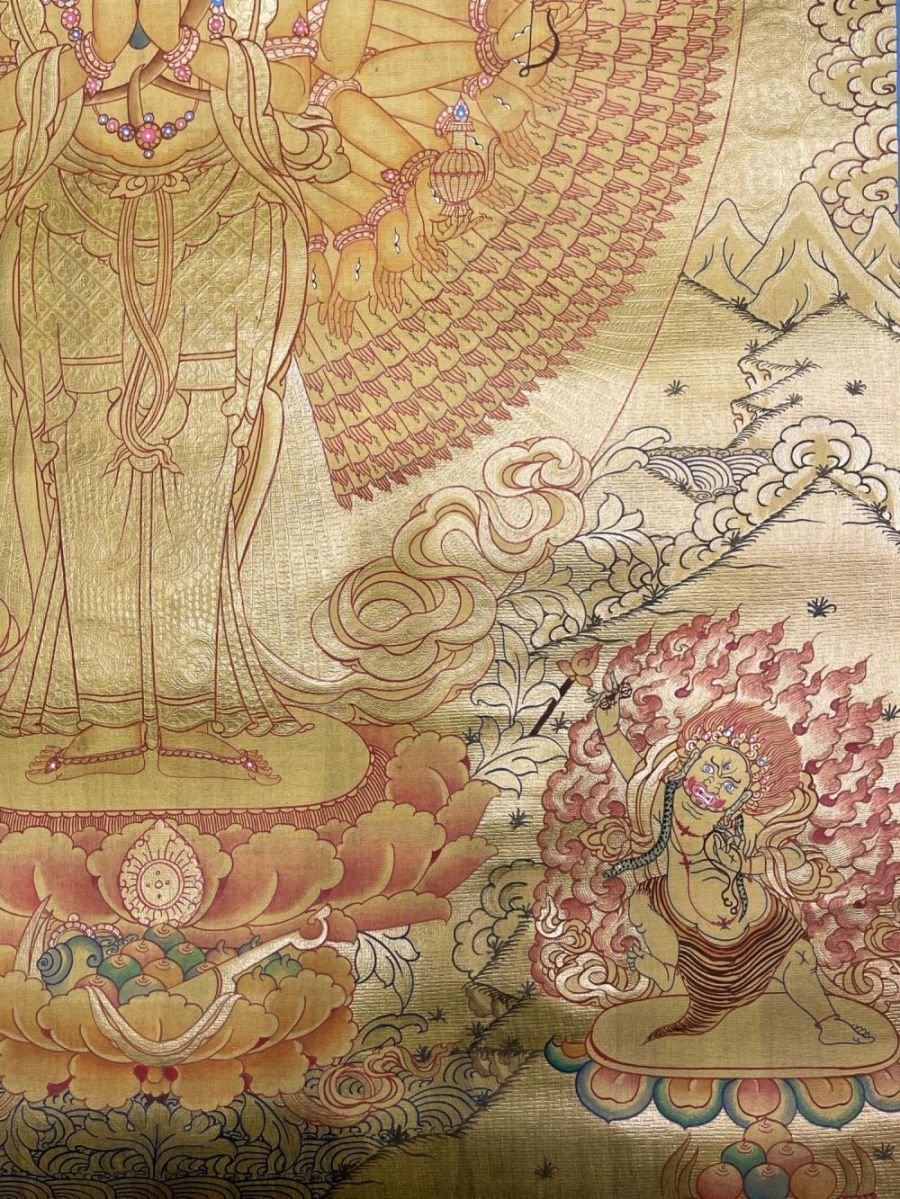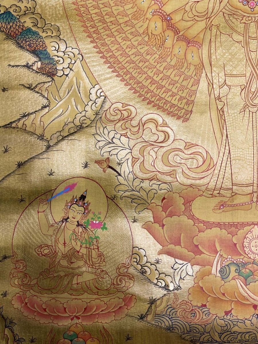 This thangka of Sahasrabhuja Avalokitesvara has real gold painted on its surface along with other paints. This is an ancient process of decorating the thangka in Tibetan Buddhism, Here gold is ground into gold dust, which is then mixed with other undisclosed material to make it paintable on the canvas. this mixture is then mixed with transparent glue and painted on the thangka. Read More