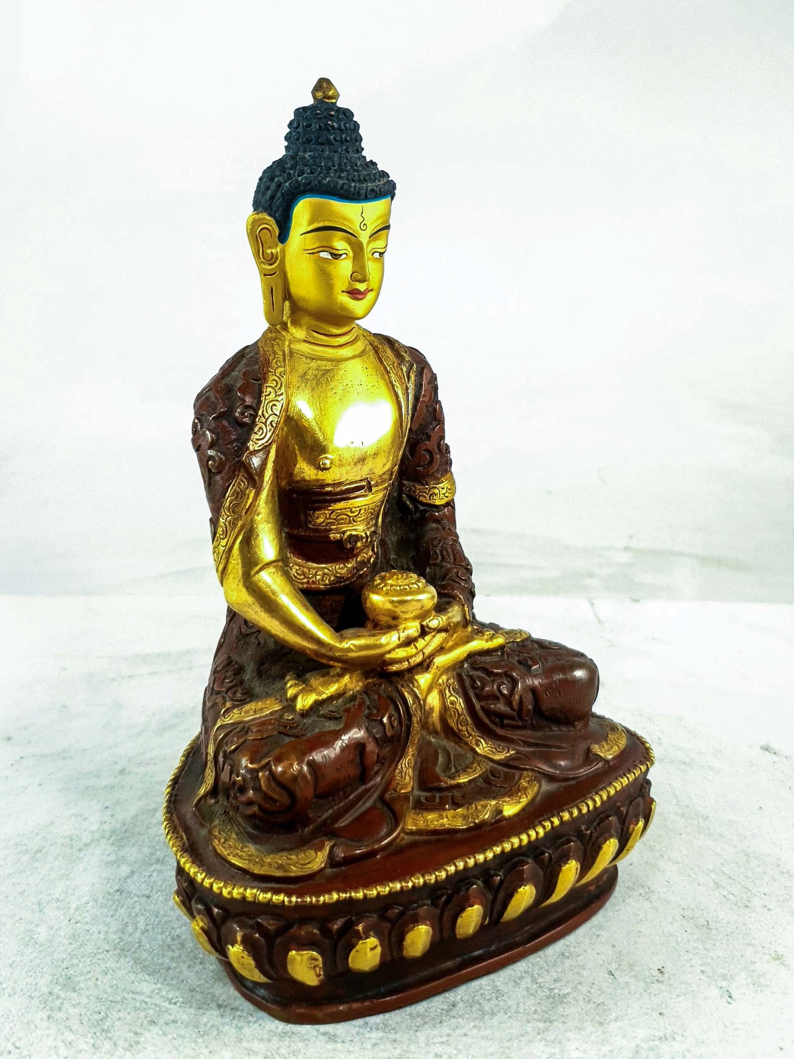 This Amitabha Buddha has a Partly gold-plated finish. Partly fire gold gilding, a common practice in Nepali handicrafts. This technique is skillfully employed by artisans to create intricate designs on various metal objects, including statues, jewelry, and decorative items. Through a process, a mask or resist is applied to safeguard specific areas from the gold plating. The object is then subjected to high temperatures, allowing the gold to beautifully adhere to exposed surfaces using a combination of heat and pressure.