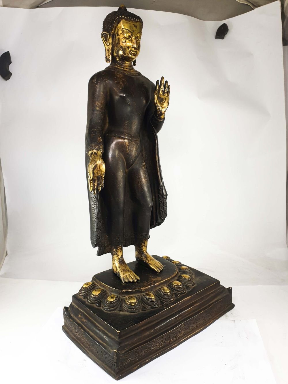 This Dipankara Buddha has a Partly gold-plated finish. Partly fire gold gilding, a common practice in Nepali handicrafts. This technique is skillfully employed by artisans to create intricate designs on various metal objects, including statues, jewelry, and decorative items. Through a process, a mask or resist is applied to safeguard specific areas from the gold plating. The object is then subjected to high temperatures, allowing the gold to beautifully adhere to exposed surfaces using a combination of heat and pressure.