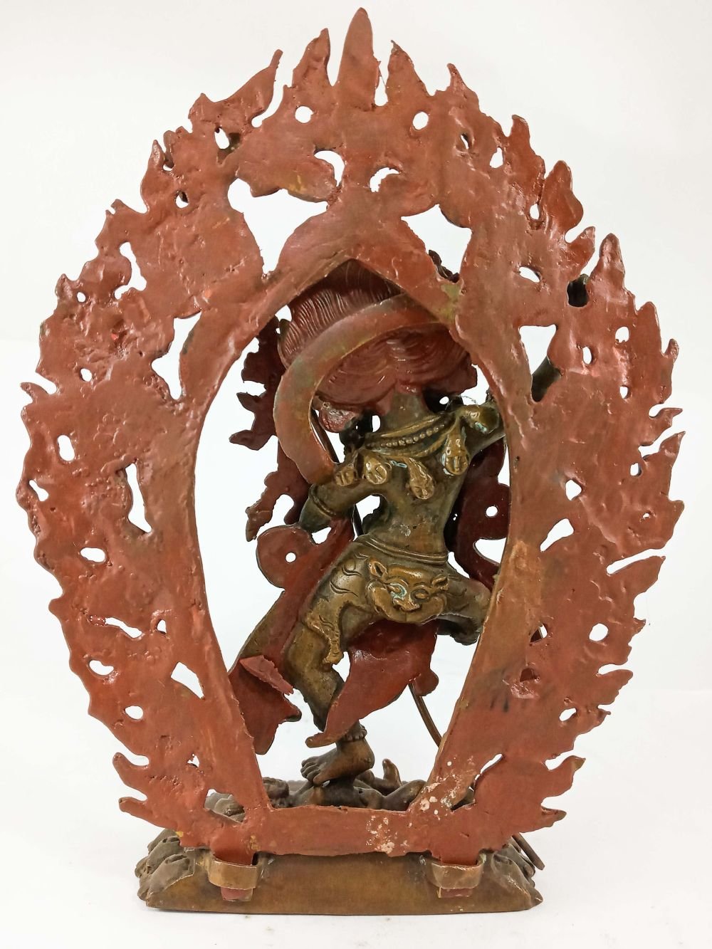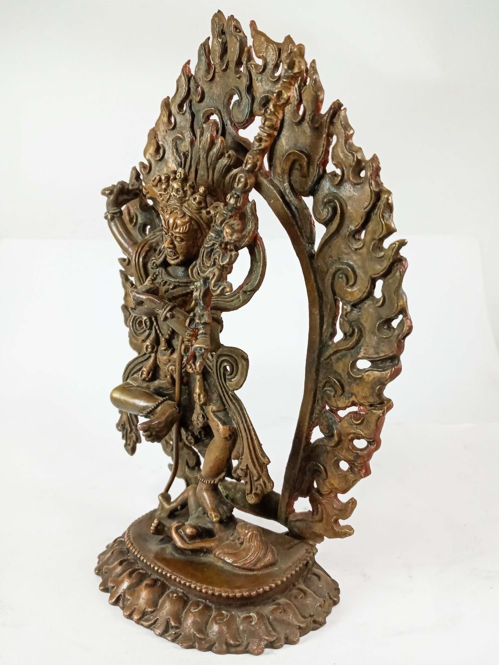 This Vajravarahi has been meticulously treated with a chocolate color antique patina. The intention behind this patina is to replicate the appearance of a copper statue that has gracefully aged over a century. Unlike a simple coat of paint, this patina is not applied superficially and is designed to endure. It undergoes an artificial oxidation process that adds depth and character, while also serving as a protective layer against natural oxidation.