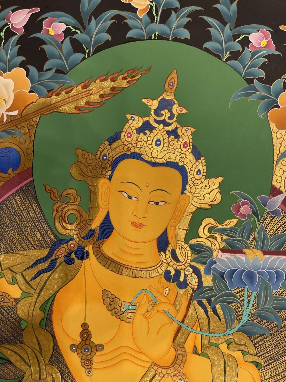 Manjushree is the Bodhisattva who holds the flaming sword [Skt. Khadga] of enlightenment, by his left hand in a warning( Tarjani) hand gesture ( Mudra) in his left hand representing his realization of wisdom to cut through ignorance & wrong view. His right hand depicted in teaching (Jnana Mudra) holds the stem of a Blue Lotus (Utpala) flower upon which rests the Book (Pustaka) of Perfection of Transcendental Wisdom. The blue lotus is a symbol of the victory of the spirit over the senses and signifies the wisdom of knowledge. This represents the lotus that he obtained from the middle of the lake in the Kathmandu Valley out of which grew a lotus bearing a Blue Flame which represents wisdom. Manjushree sits upon a moon disc upon a lotus with an elongated stem arising from a lake. He wears a gold diadem fitted with precious jewels. He wears a silk scarf fastened at the waist and over this, a softly glowing green scarf decorated with golden motifs. His head is silhouetted against a nimbus. The lotus he is sitting on has an elongated stem and arises from a lake representing his recovery of the blue flame of transcendent wisdom and the teaching he originated. The white sash is the attire of the Vajrayana school of Buddhism.