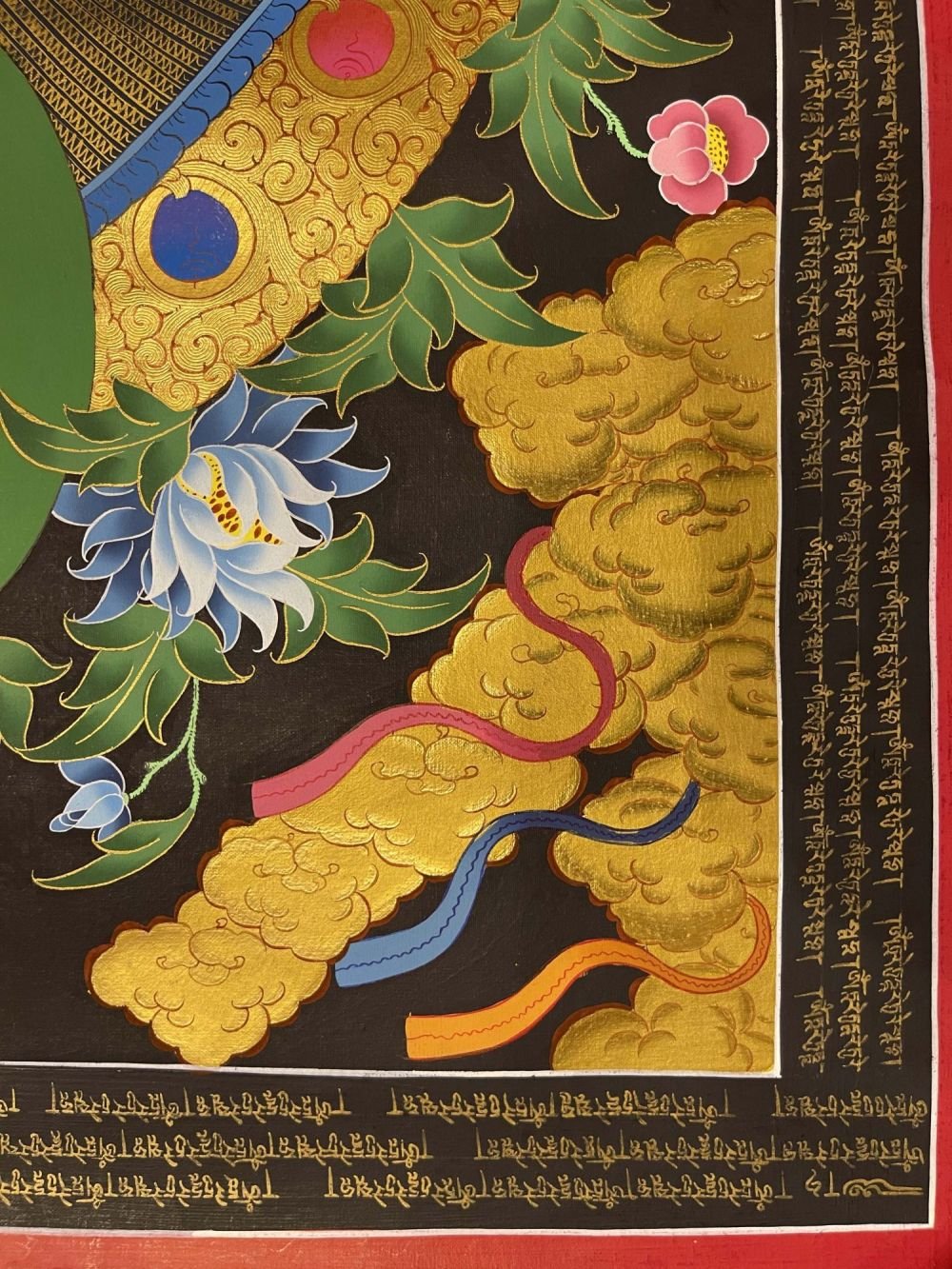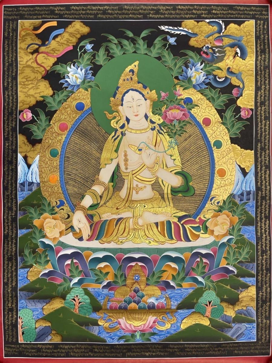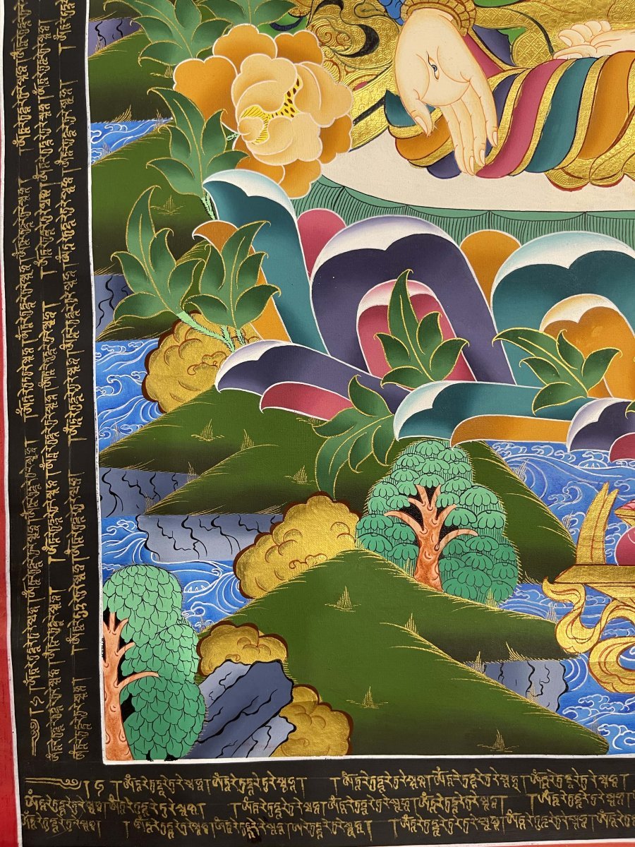 This thangka of White Tara has real gold painted on its surface along with other paints. This is an ancient process of decorating the thangka in Tibetan Buddhism, Here gold is ground into gold dust, which is then mixed with other undisclosed material to make it paintable on the canvas. this mixture is then mixed with transparent glue and painted on the thangka. Read More