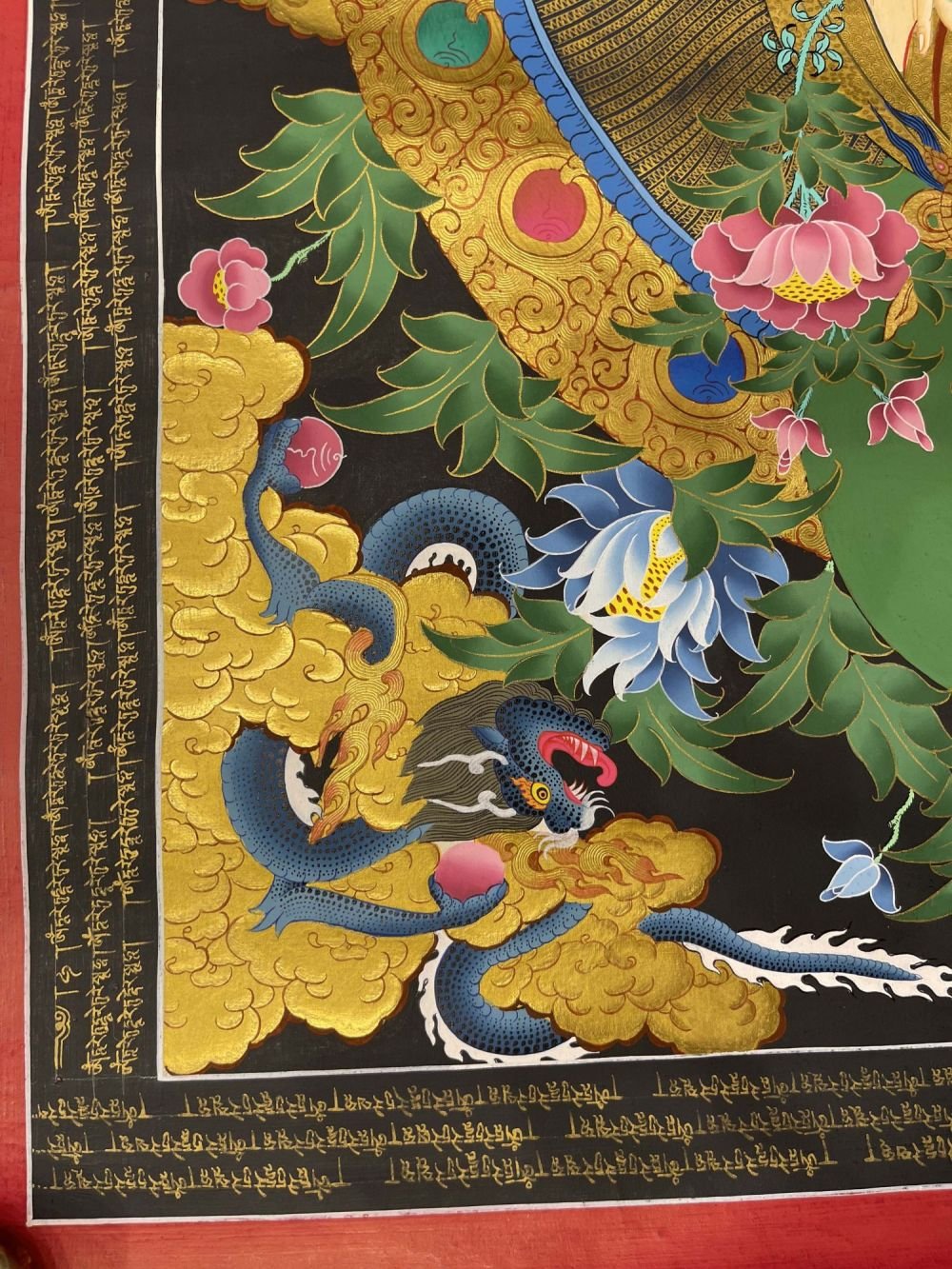 A thangka, also known as tangka, thanka, or tanka, is a vibrant and intricate Tibetan Buddhist painting that serves as a visual representation of spiritual teachings. Crafted with meticulous detail on cotton or silk appliqué, thangkas depict a wide range of subjects including Buddhist deities, sacred scenes, mandalas, and narrative stories. These sacred artworks are traditionally kept unframed and rolled up for storage, resembling ancient scrolls. To protect their delicate nature, thangkas are mounted on textile backings and often adorned with a silk cover on the front. Proper preservation in dry environments is crucial to maintain the integrity and longevity of the silk. Read More