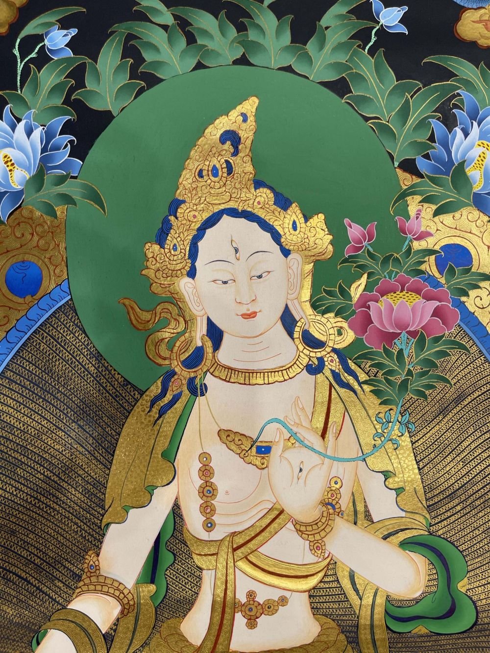 Buddhist Hand Painted Thangka of White Tara, Real Gold, Lamas Art , Goddess of longevity, healing, and serene compassion