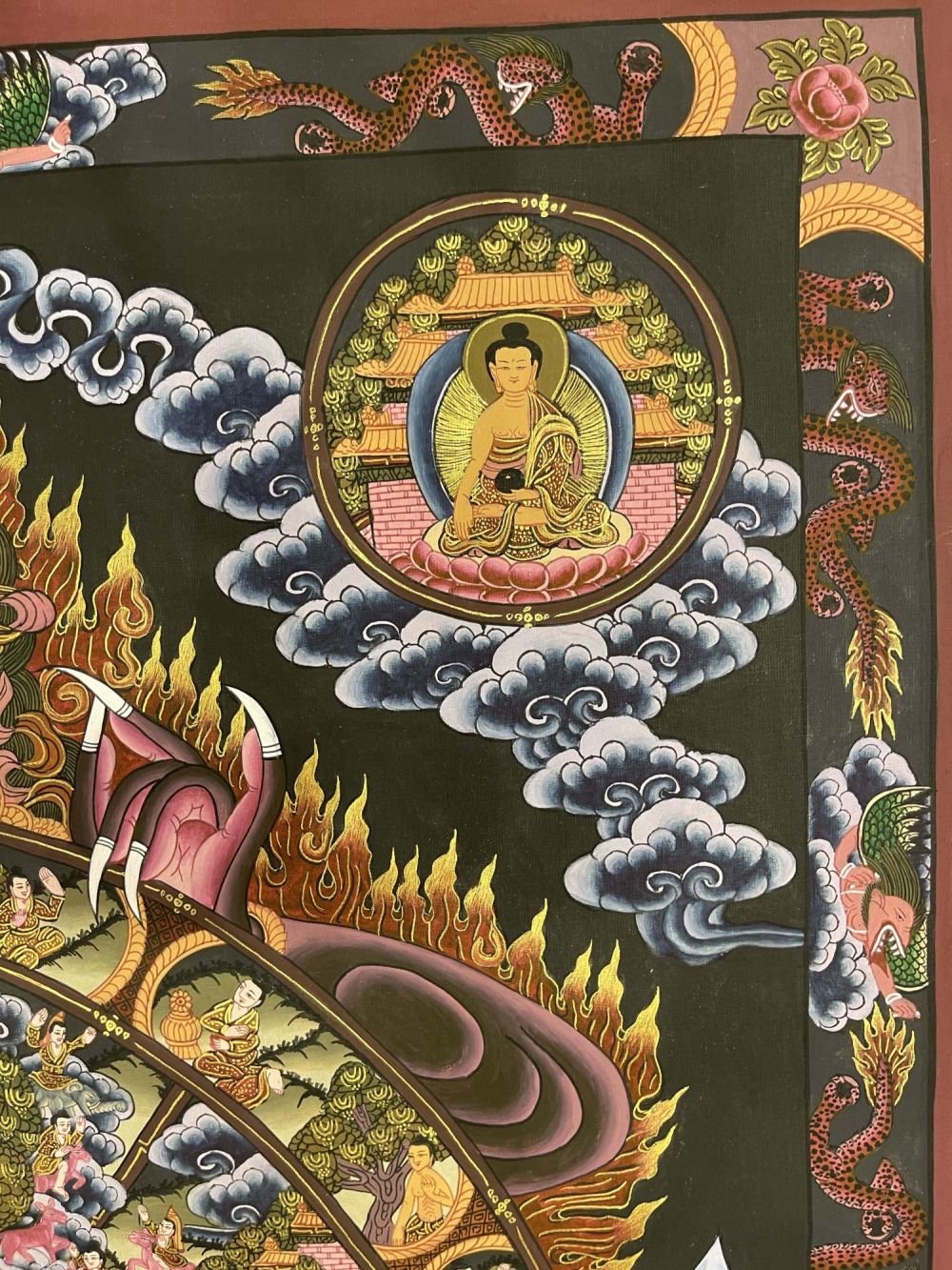 The outer rim of the wheel is divided into twelve sections that represent the Twelve Links of Dependent Origination.