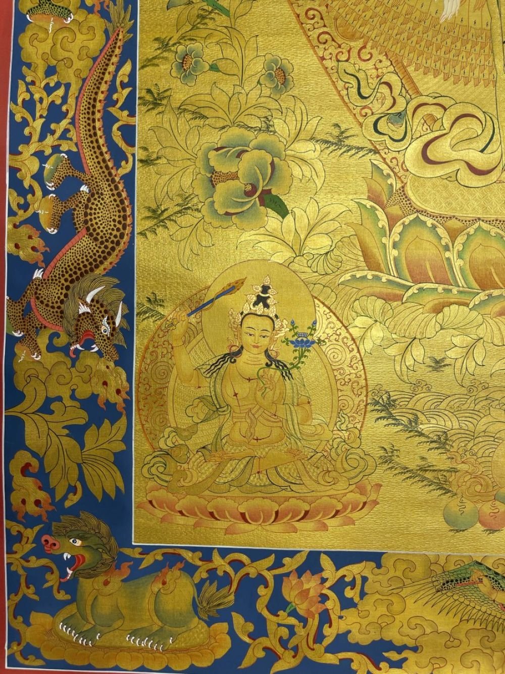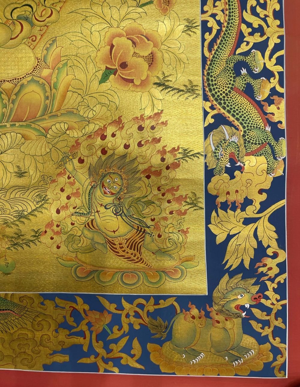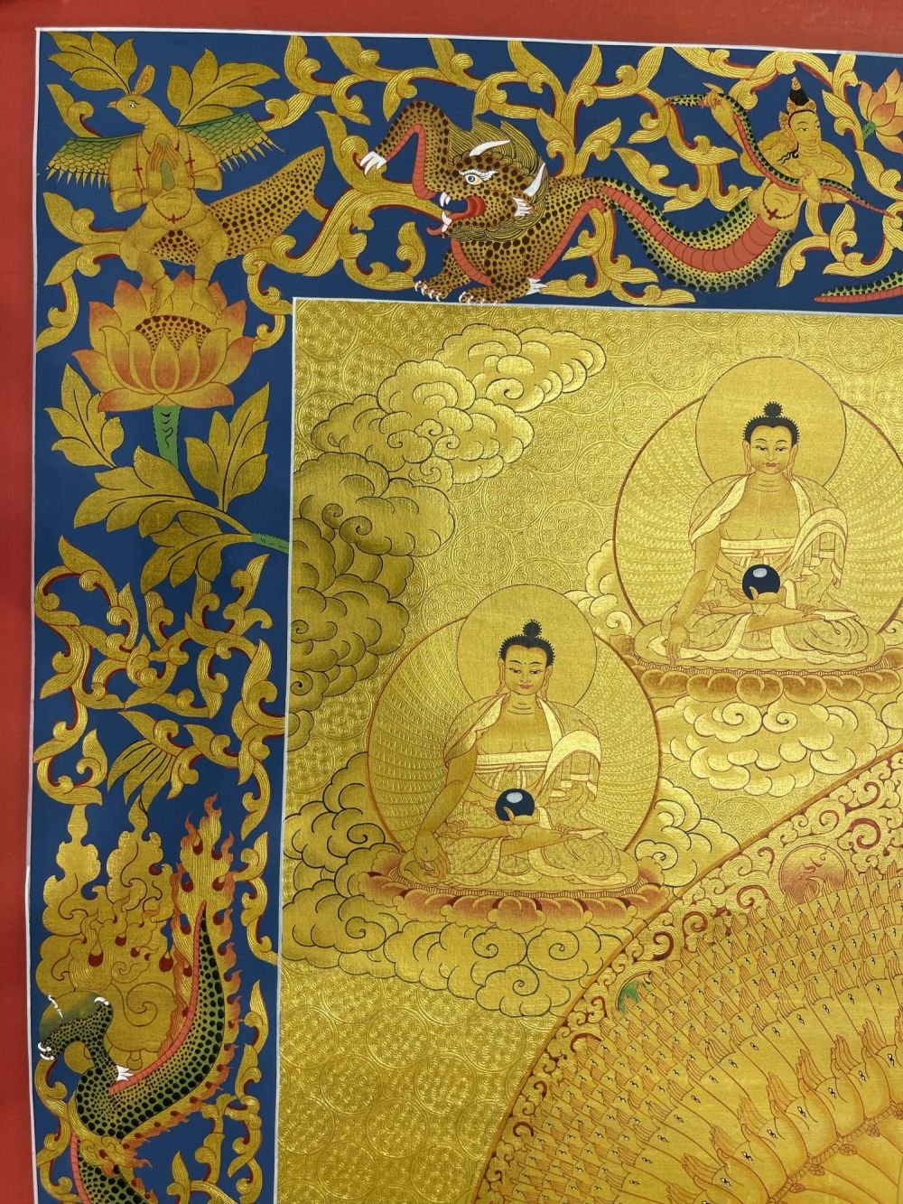 This thangka of Sahasrabhuja Avalokitesvara has real gold painted on its surface along with other paints. This is an ancient process of decorating the thangka in Tibetan Buddhism, Here gold is ground into gold dust, which is then mixed with other undisclosed material to make it paintable on the canvas. this mixture is then mixed with transparent glue and painted on the thangka. Read More