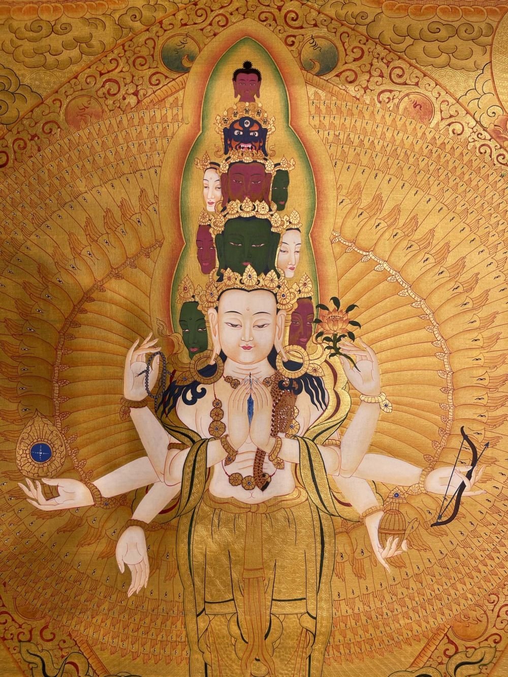 Sahasrabhuja Avalokiteshvara the Thousand-Armed, Thousand-Eyed form of Avalokiteshvara, the Bodhisattva of Infinite Compassion. Each of the 1,000 hands represents his boundless ability to help all sentient beings, while the eye in each palm symbolizes wisdom and omnipresent awareness.