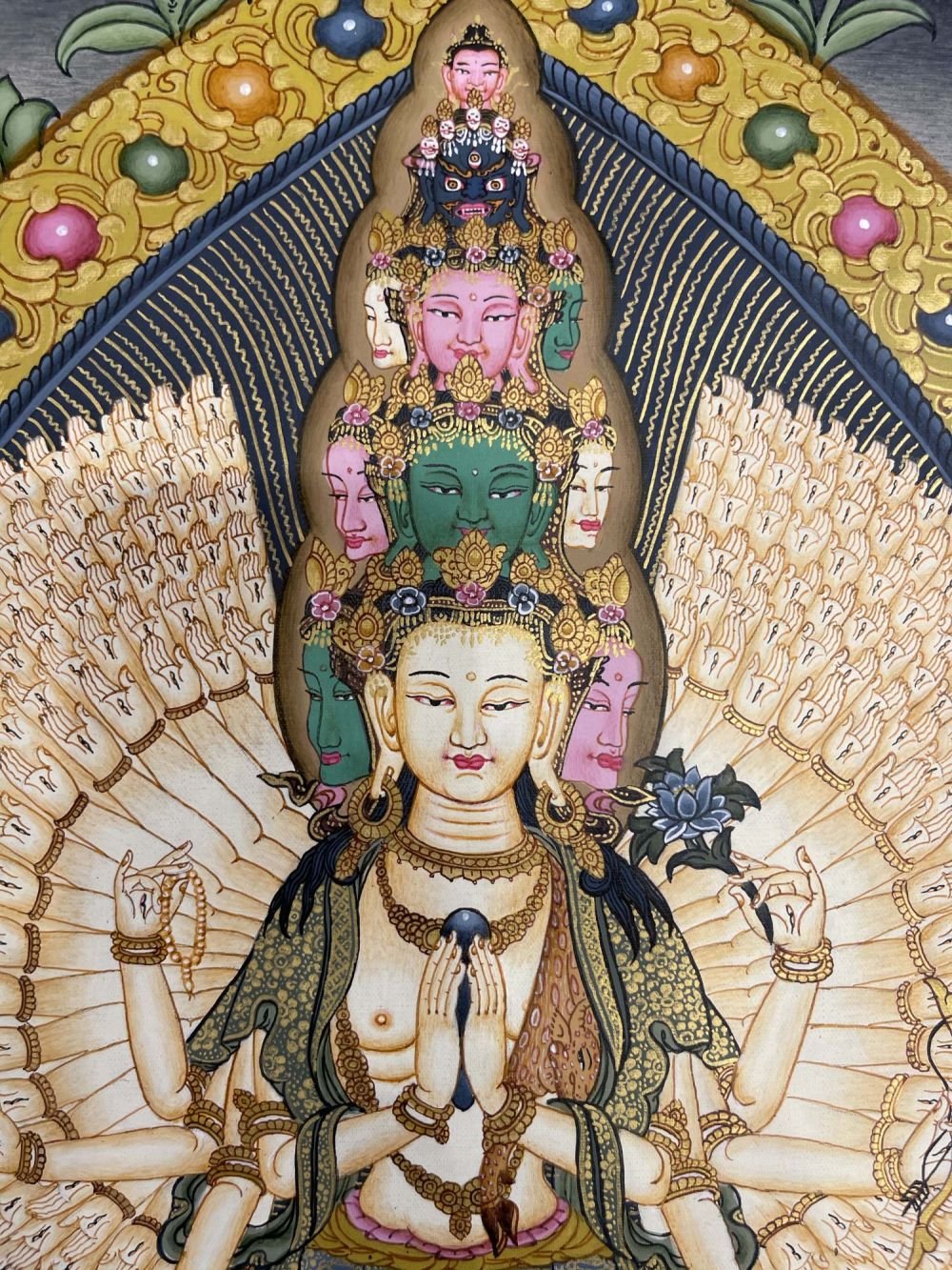 Sahasrabhuja Avalokiteshvara the Thousand-Armed, Thousand-Eyed form of Avalokiteshvara, the Bodhisattva of Infinite Compassion. Each of the 1,000 hands represents his boundless ability to help all sentient beings, while the eye in each palm symbolizes wisdom and omnipresent awareness.