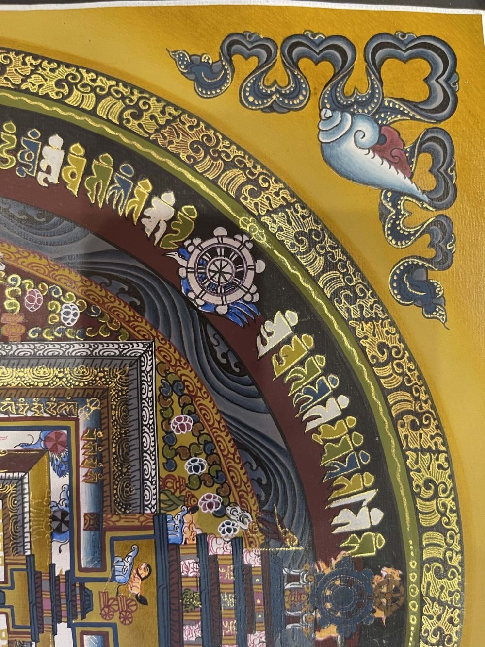 Although depicted here on a flat surface, the mandala is actually three-dimensional, being a five-storeyed "divine mansion", at the centre of which stands the Kalachakra deity the manifest state of Enlightenment.