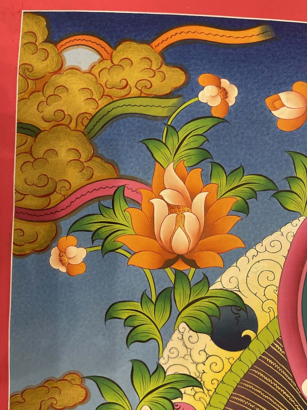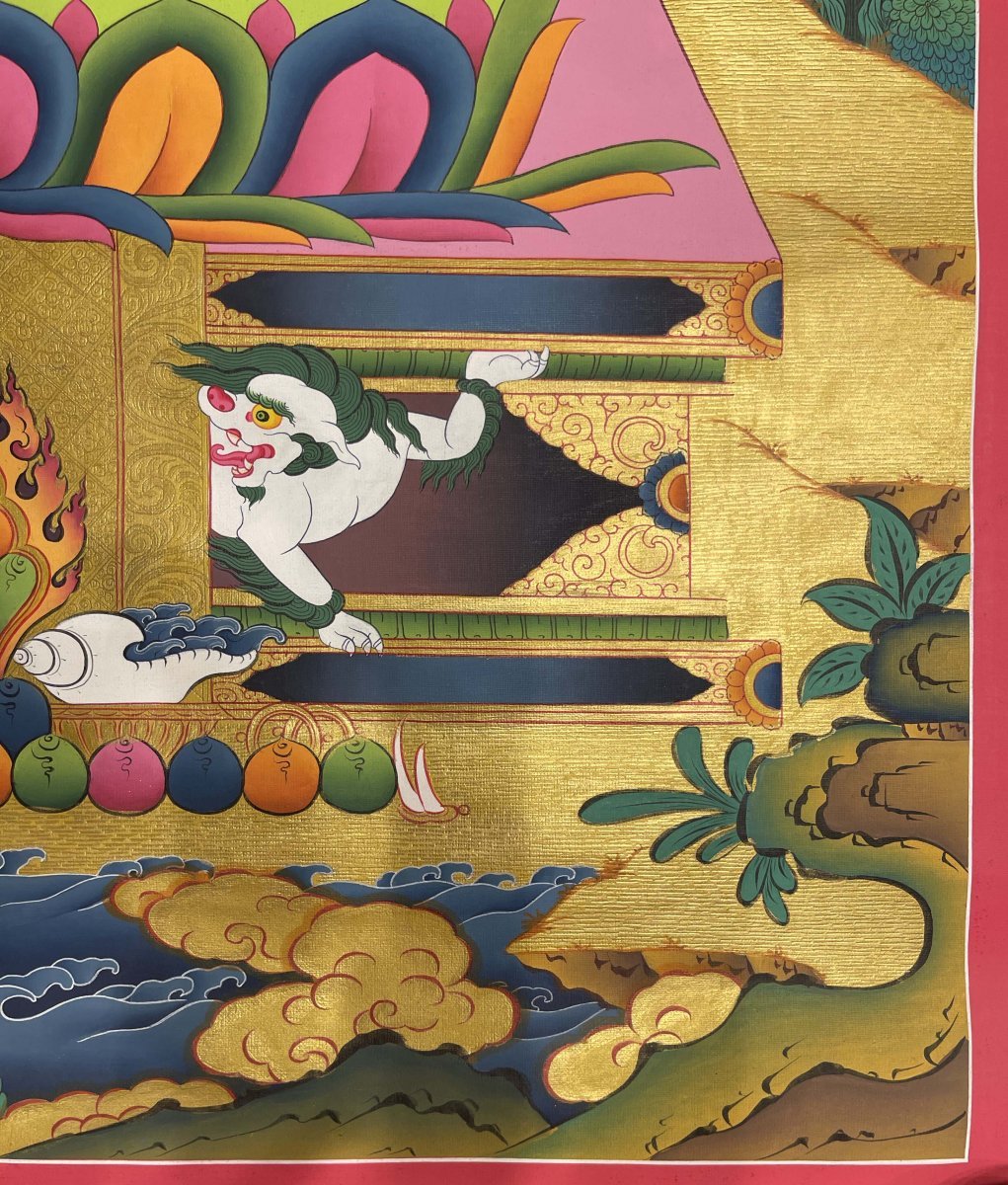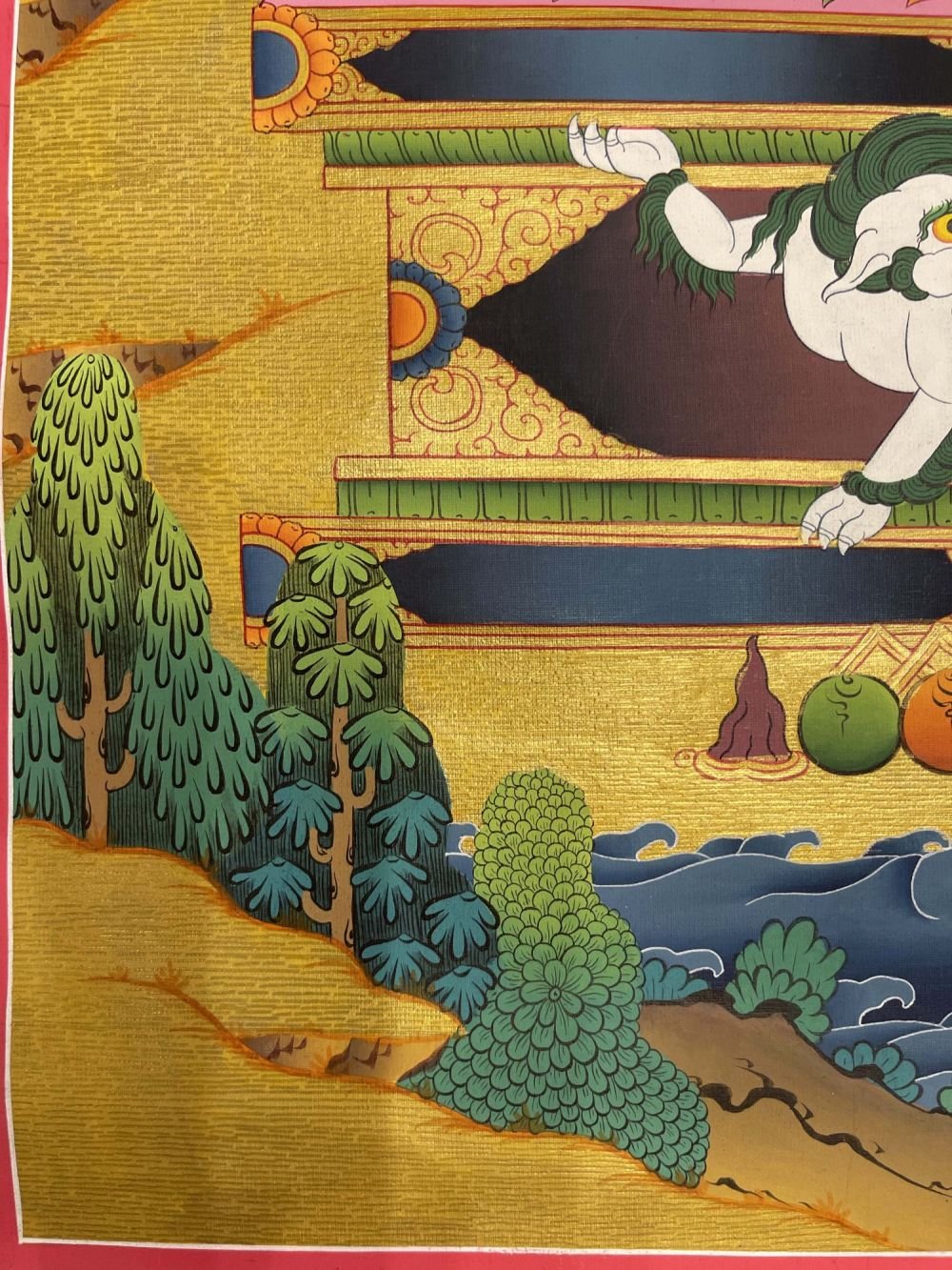 A thangka, also known as tangka, thanka, or tanka, is a vibrant and intricate Tibetan Buddhist painting that serves as a visual representation of spiritual teachings. Crafted with meticulous detail on cotton or silk appliqué, thangkas depict a wide range of subjects including Buddhist deities, sacred scenes, mandalas, and narrative stories. These sacred artworks are traditionally kept unframed and rolled up for storage, resembling ancient scrolls. To protect their delicate nature, thangkas are mounted on textile backings and often adorned with a silk cover on the front. Proper preservation in dry environments is crucial to maintain the integrity and longevity of the silk. Read More