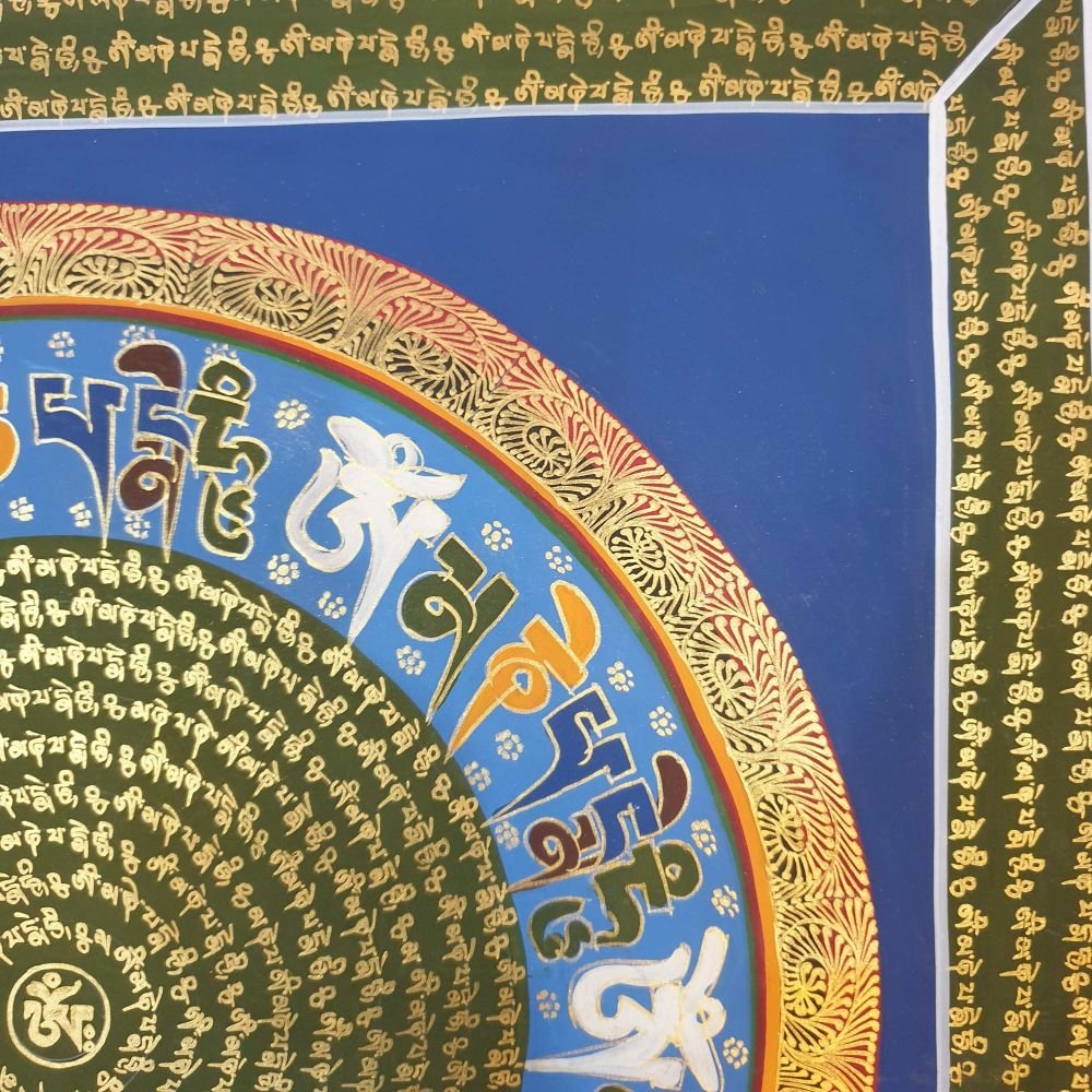 OM MANI PADME HUM is also inscribed in Mandala paintings. Those kinds of mandala have OM MANI PADME HUM in a circular fashion, and mantras are painted in concentric circles from the surface to the center of the circle. They come under the categories of the Mantra Mandala. These mandalas are usually found hanging on the walls of Buddhist monasteries and are often used in meditation halls for focus and concentration purposes.