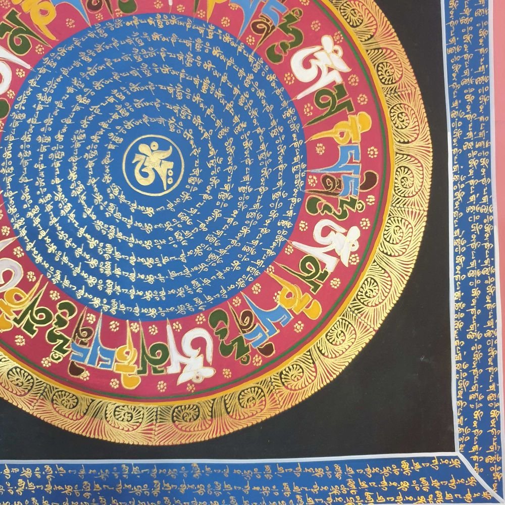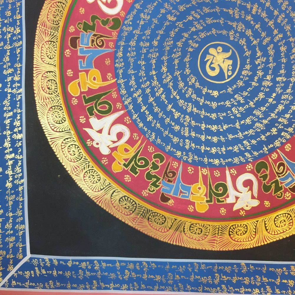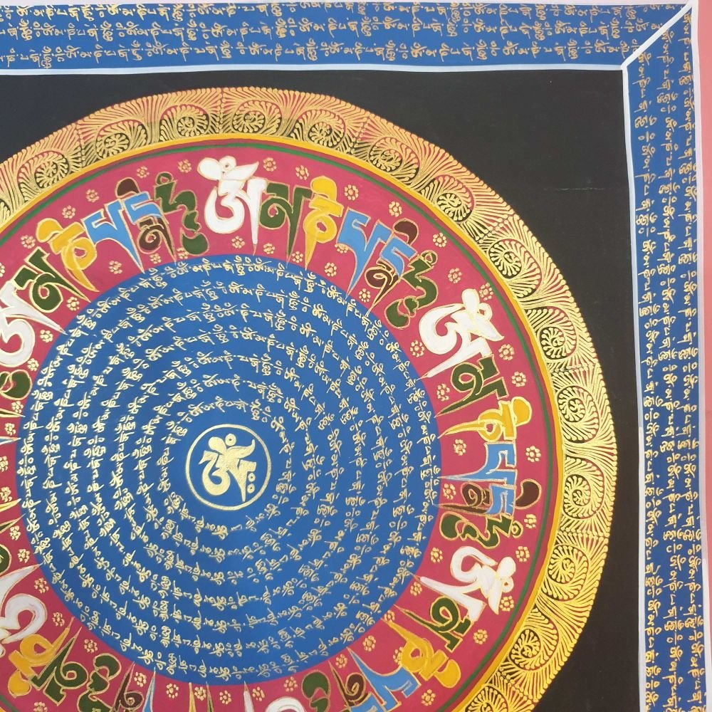 OM MANI PADME HUM is also inscribed in Mandala paintings. Those kinds of mandala have OM MANI PADME HUM in a circular fashion, and mantras are painted in concentric circles from the surface to the center of the circle. They come under the categories of the Mantra Mandala. These mandalas are usually found hanging on the walls of Buddhist monasteries and are often used in meditation halls for focus and concentration purposes.