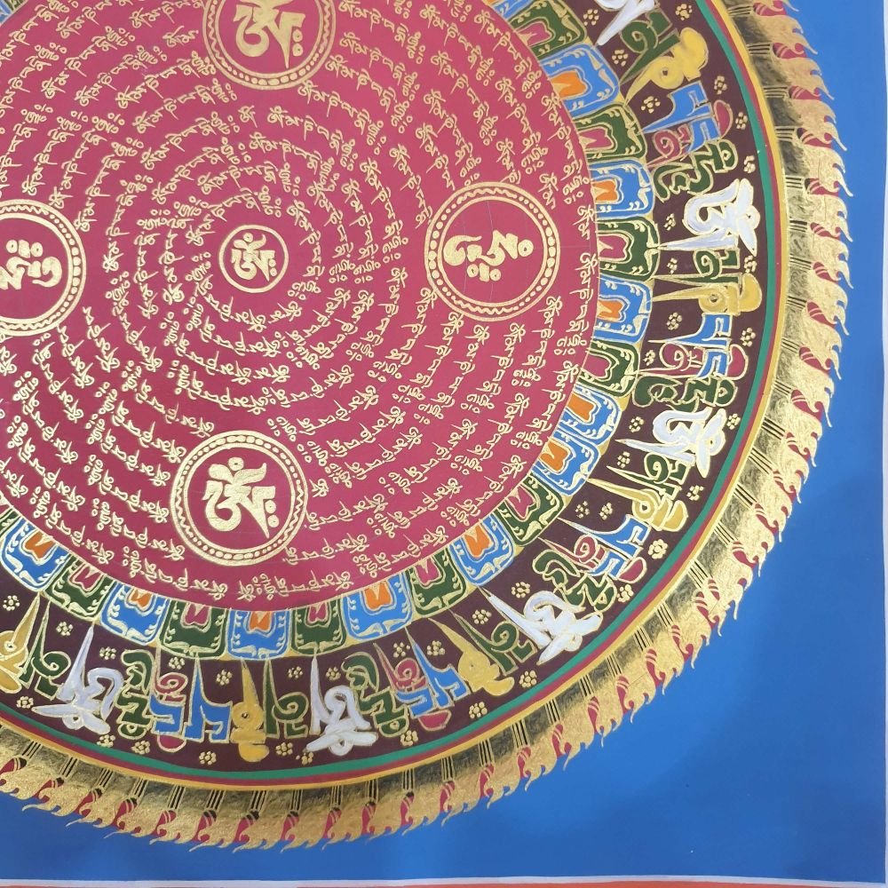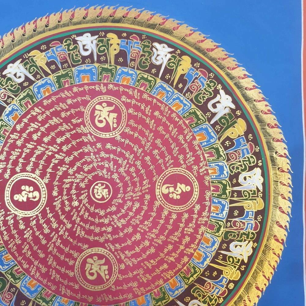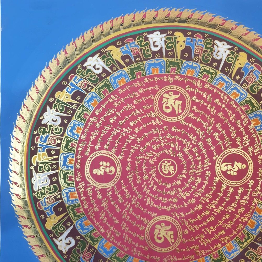 OM MANI PADME HUM is also inscribed in Mandala paintings. Those kinds of mandala have OM MANI PADME HUM in a circular fashion, and mantras are painted in concentric circles from the surface to the center of the circle. They come under the categories of the Mantra Mandala. These mandalas are usually found hanging on the walls of Buddhist monasteries and are often used in meditation halls for focus and concentration purposes.