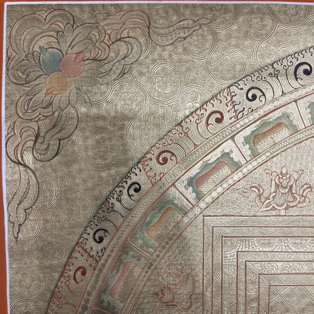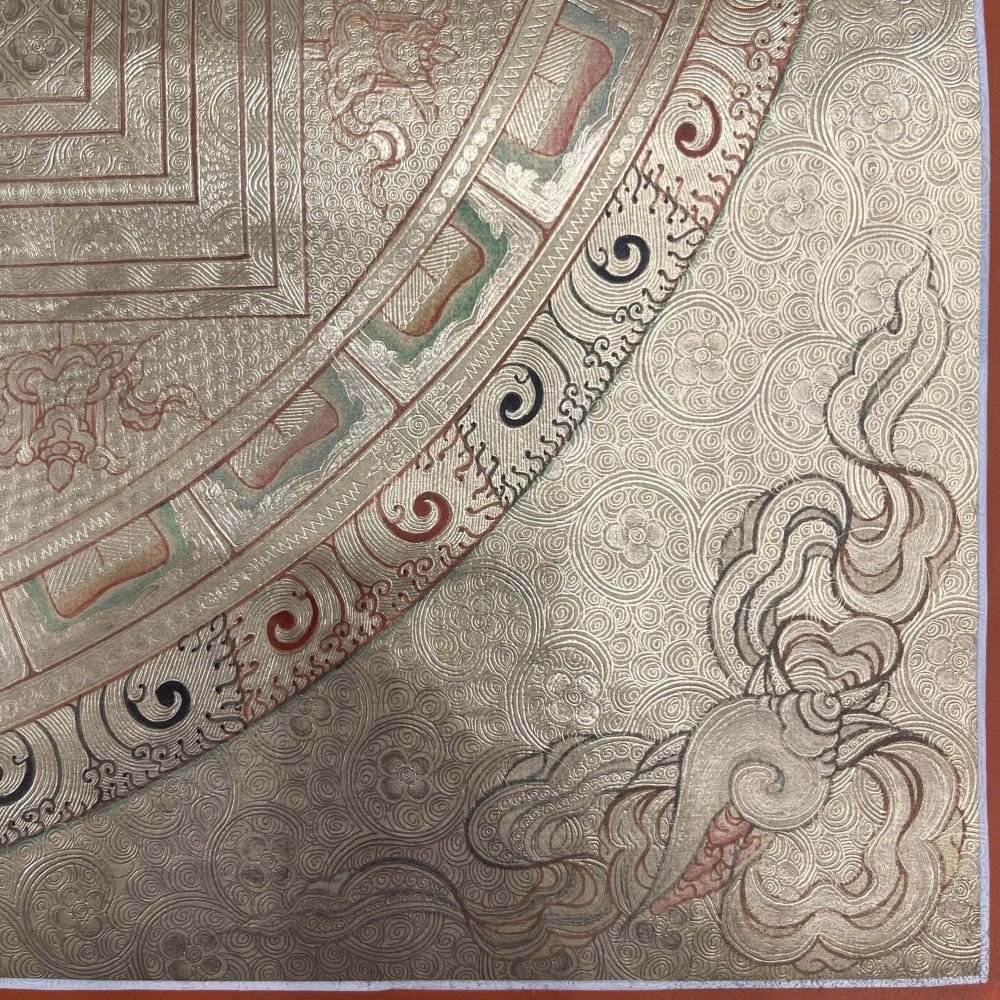 Buddhist Hand Painted Thangka of Yellow Jambhala, Mandala Real Silver, Lamas Art, Square Mandala , fostering generosity and abundance
