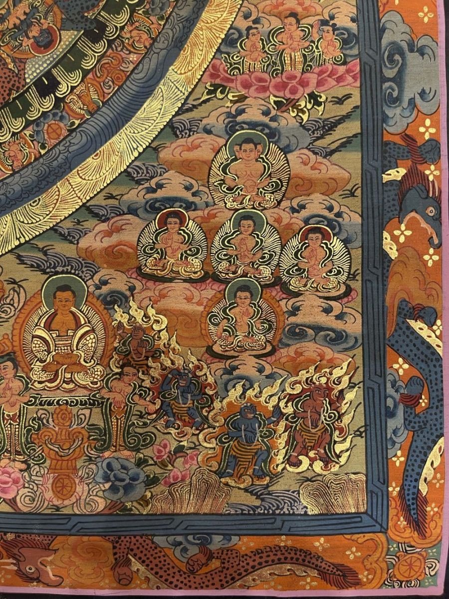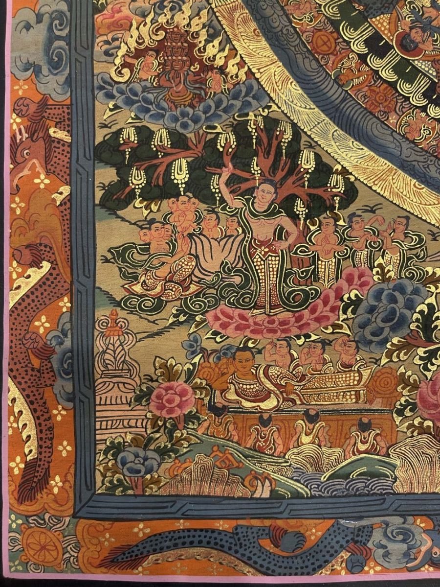Mandala Thangka painting is a revered form of sacred art in Buddhism, characterized by intricate and vibrant depictions on cotton or silk. These paintings often feature a central deity or Buddha figure surrounded by meticulously crafted symmetrical patterns, geometric designs, and symbolic elements. Mandala Thangkas serve as visual aids for meditation and spiritual growth, guiding practitioners towards inner peace, harmony, and enlightenment. Through their precise brushwork and rich symbolism, these artworks invite viewers to contemplate the profound spiritual journey within themselves, fostering mindfulness, concentration, and a deeper connection with the universal truths of Buddhism. Read More