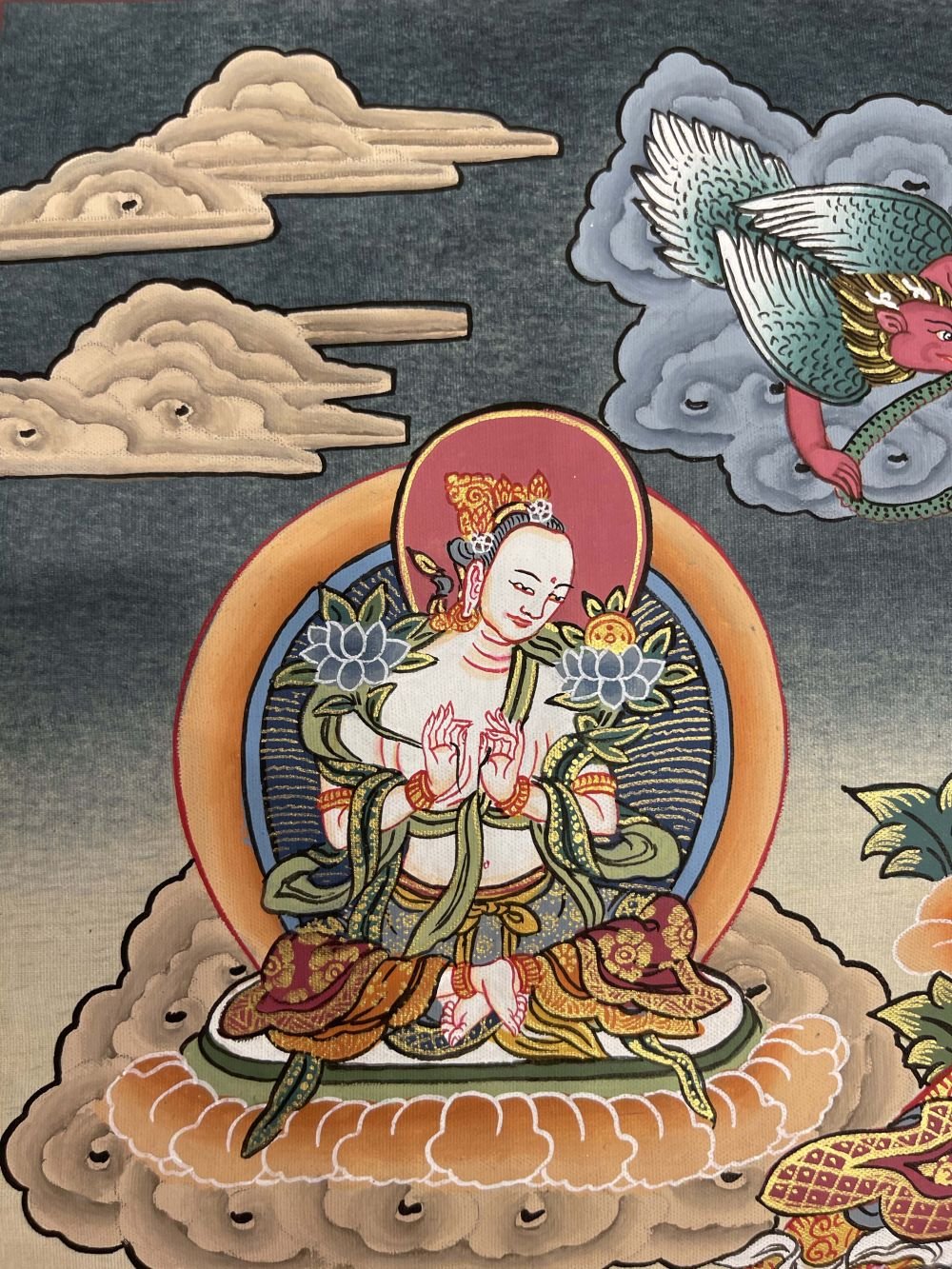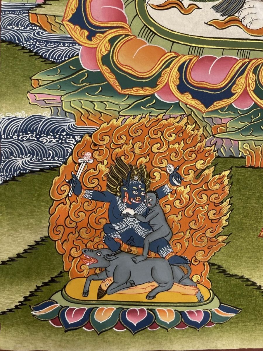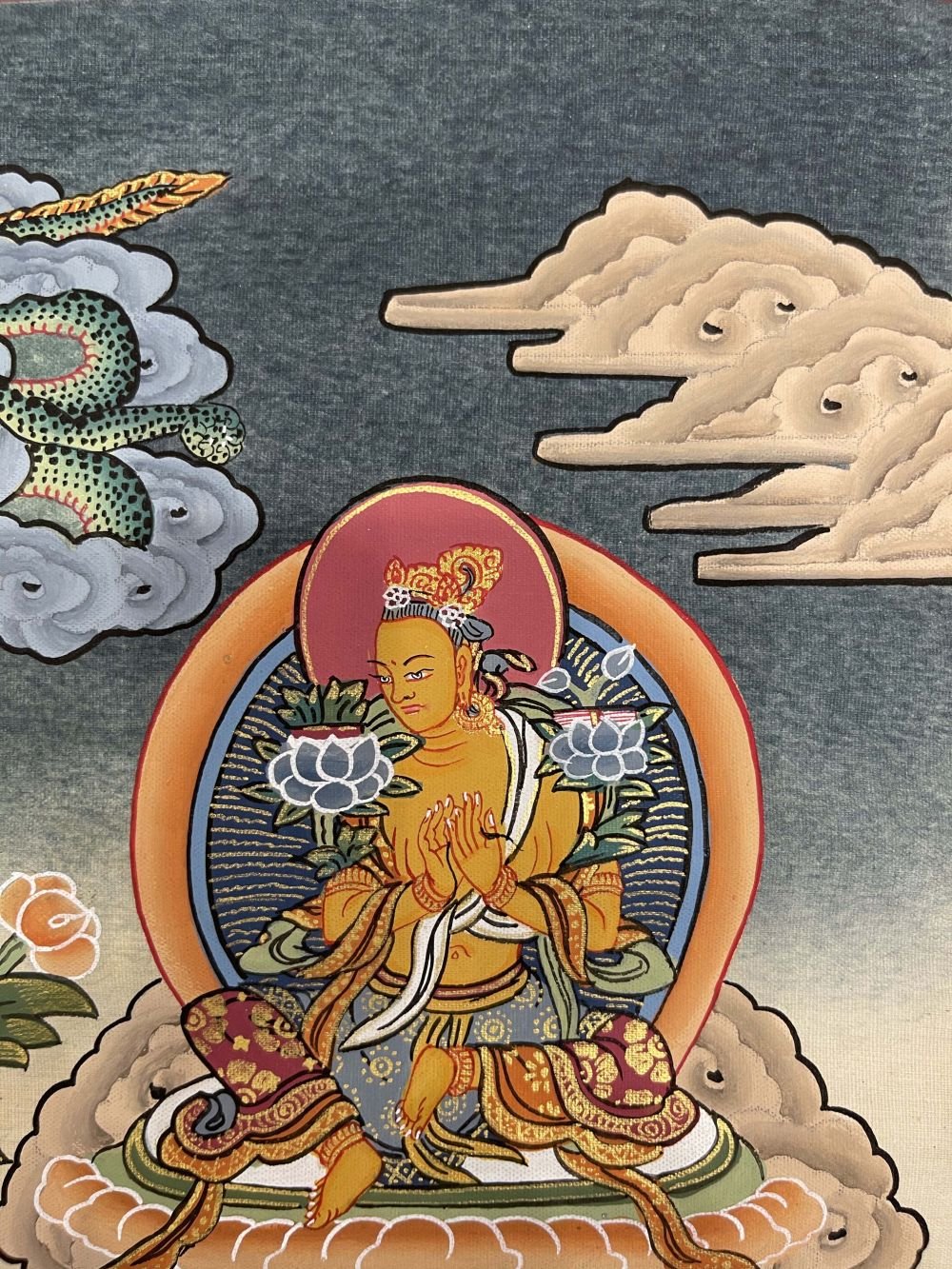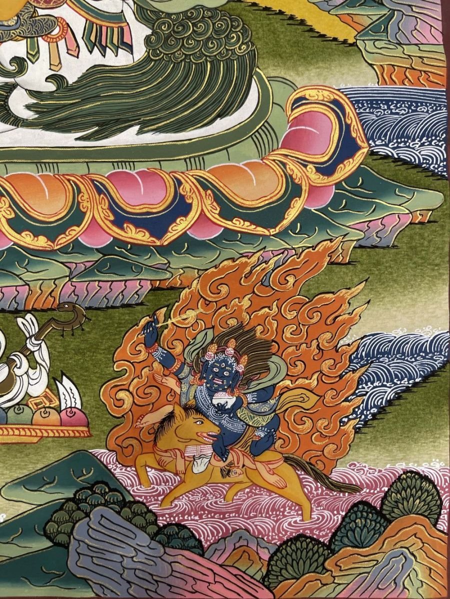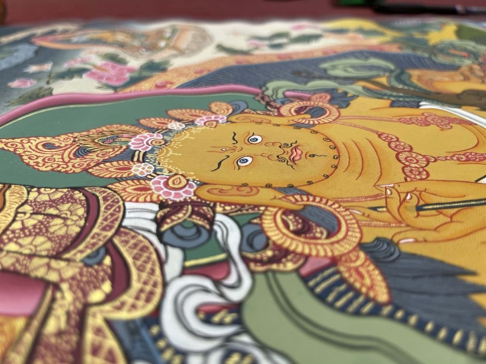 This thangka of Jambhala: namtose has real gold painted on its surface along with other paints. This is an ancient process of decorating the thangka in Tibetan Buddhism, Here gold is ground into gold dust, which is then mixed with other undisclosed material to make it paintable on the canvas. this mixture is then mixed with transparent glue and painted on the thangka. Read More