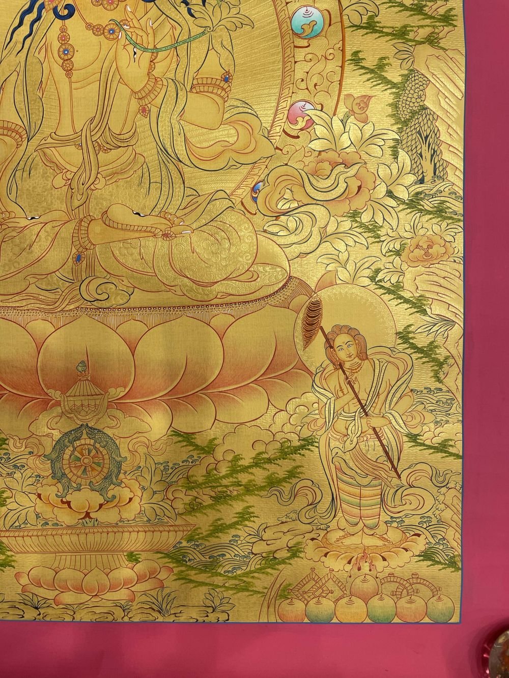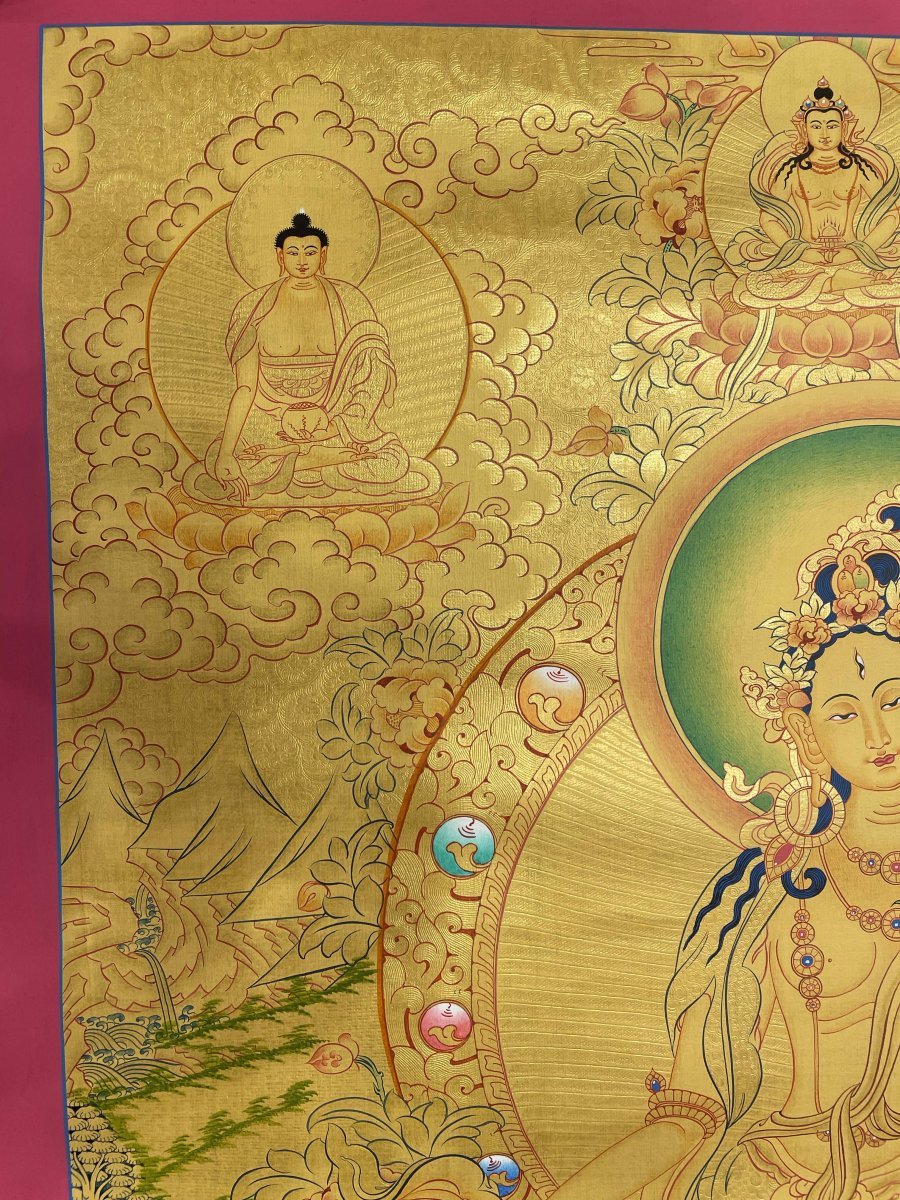 This thangka of White Tara has real gold painted on its surface along with other paints. This is an ancient process of decorating the thangka in Tibetan Buddhism, Here gold is ground into gold dust, which is then mixed with other undisclosed material to make it paintable on the canvas. this mixture is then mixed with transparent glue and painted on the thangka. Read More