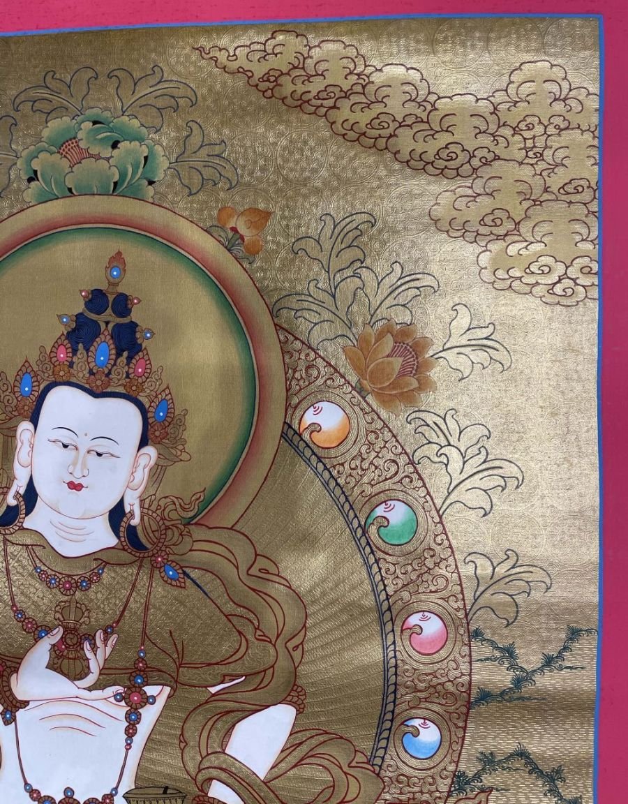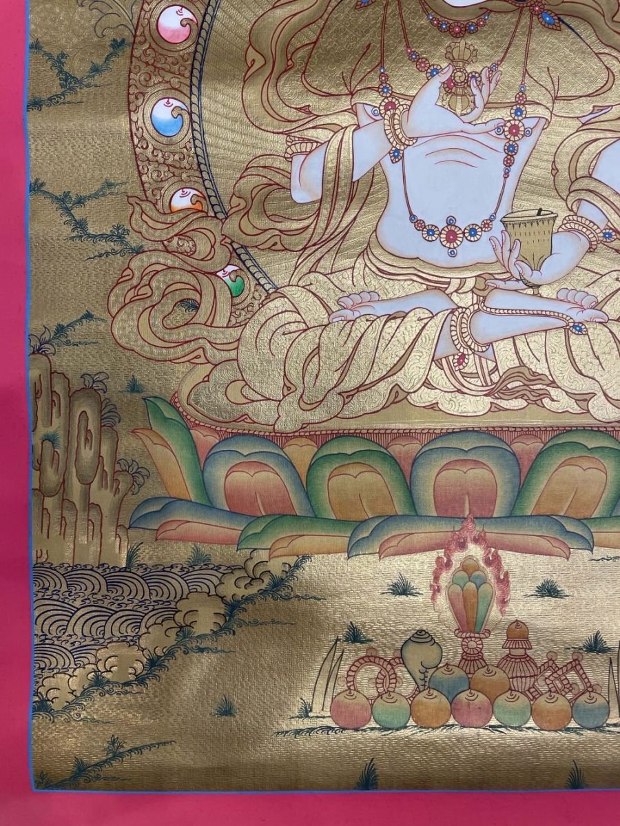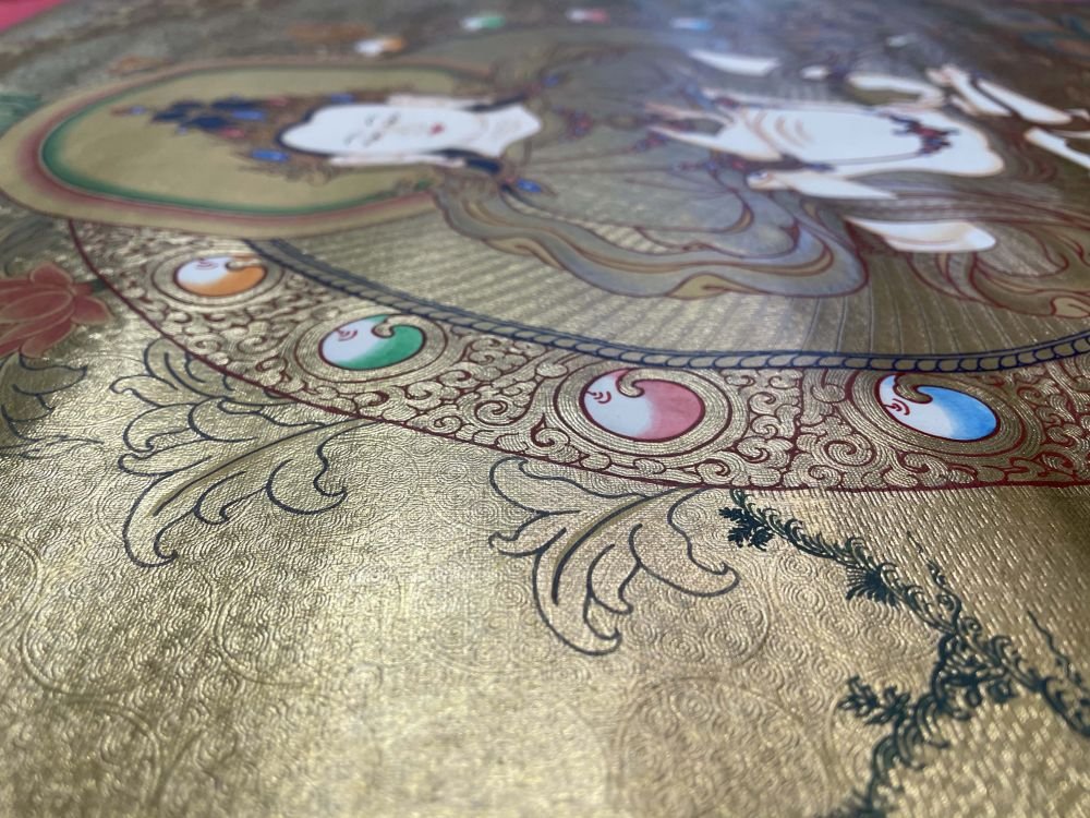 This thangka of Vajrasattva has real gold painted on its surface along with other paints. This is an ancient process of decorating the thangka in Tibetan Buddhism, Here gold is ground into gold dust, which is then mixed with other undisclosed material to make it paintable on the canvas. this mixture is then mixed with transparent glue and painted on the thangka. Read More
