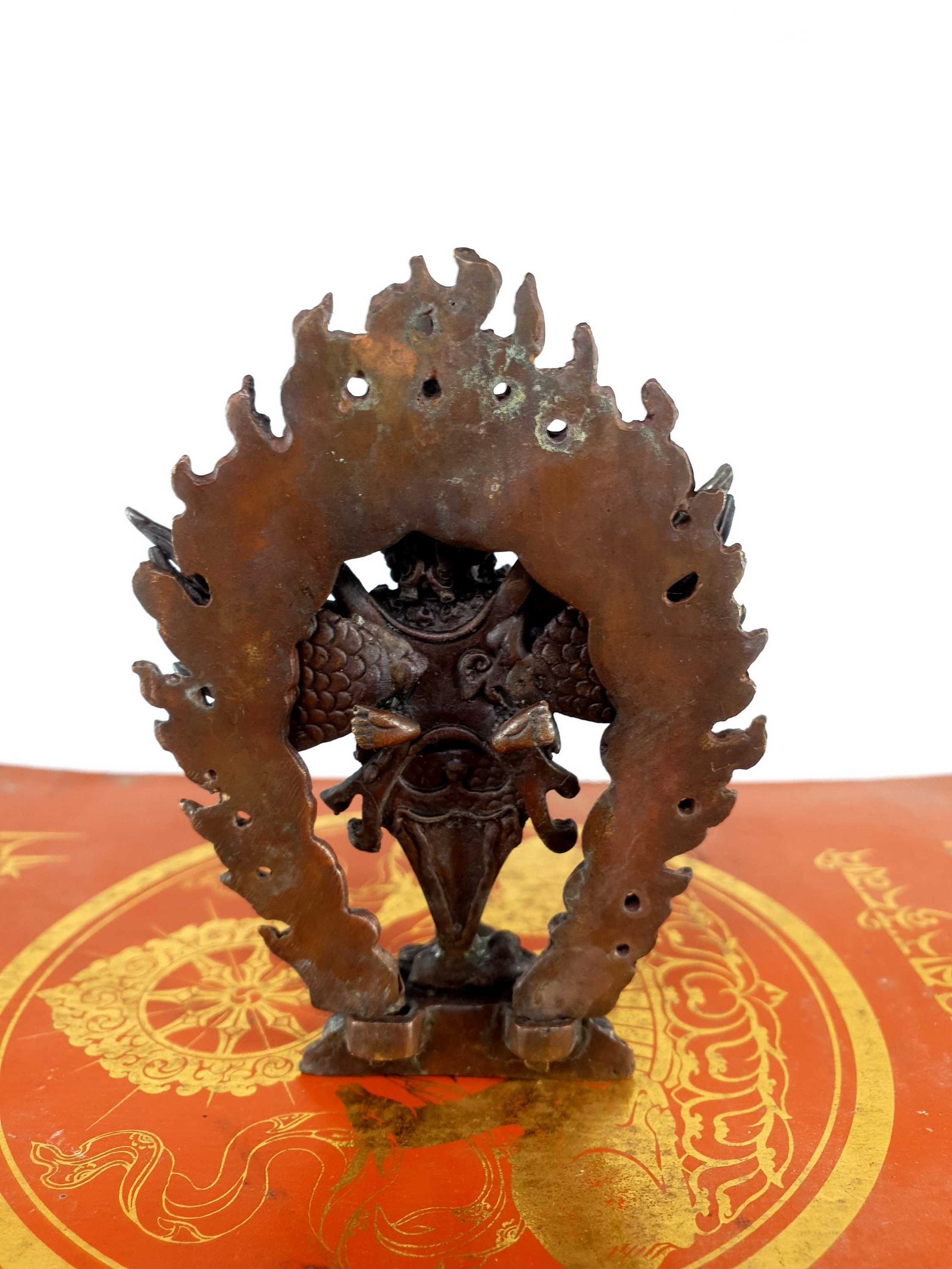 This Vajrakilaya has been meticulously treated with a chocolate color antique patina. The intention behind this patina is to replicate the appearance of a copper statue that has gracefully aged over a century. Unlike a simple coat of paint, this patina is not applied superficially and is designed to endure. It undergoes an artificial oxidation process that adds depth and character, while also serving as a protective layer against natural oxidation.